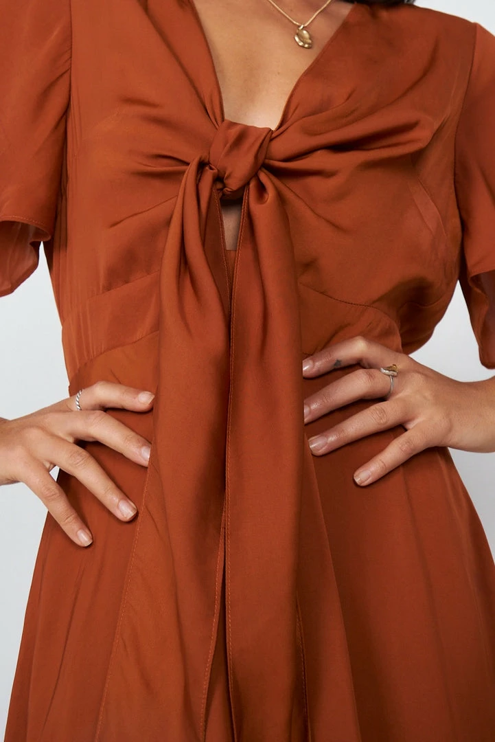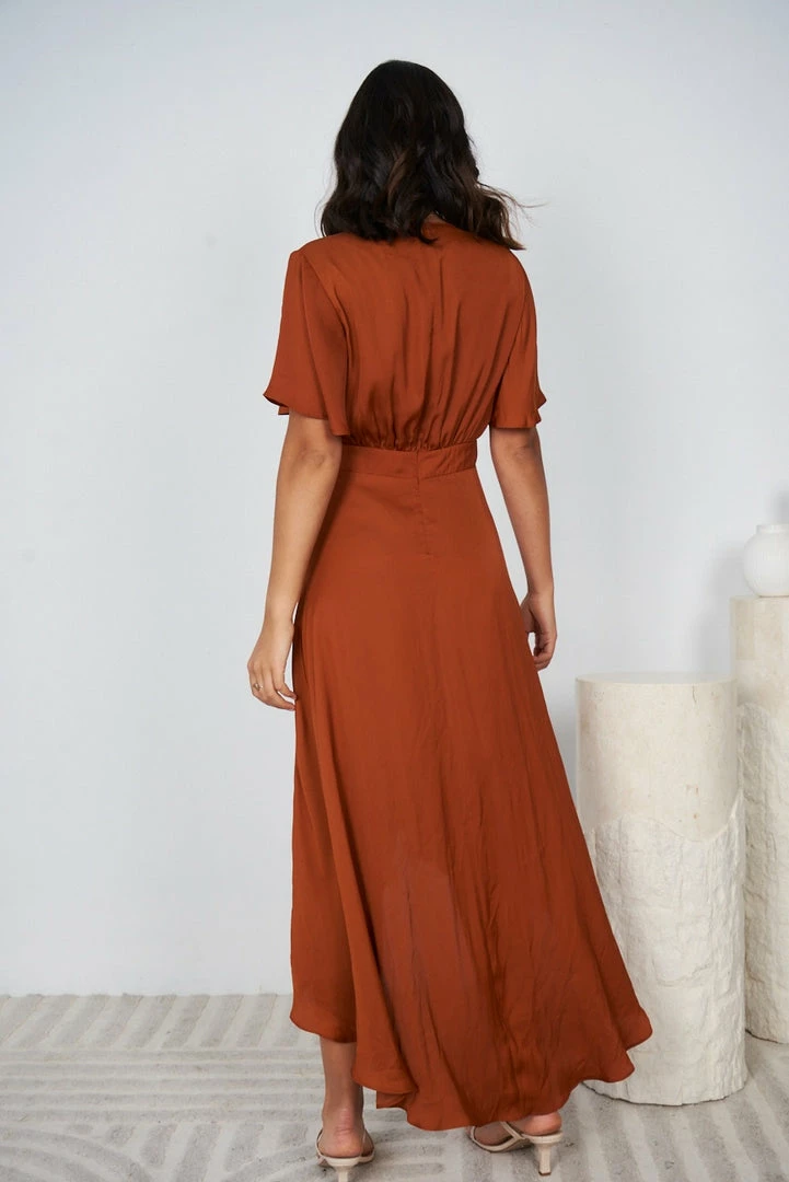 Our Bryla Dress is a summery play on our best selling Bryleigh Dresses. It’s a gorgeous lightweight material in a gorgeous orange rust tone. It features a high low hemline that floats around the body. The butterfly sleeves are light & airy sure to keep you cool during the warming months. The bust features a tie detail that makes this adjustable for various bust sizes.