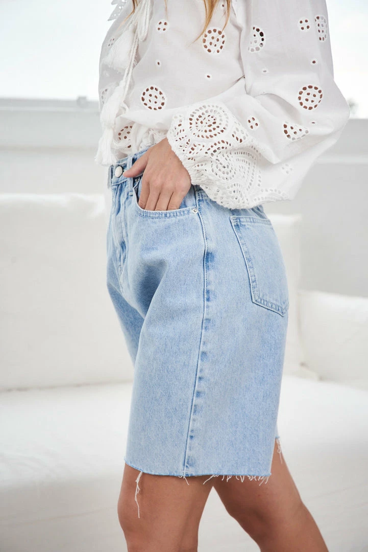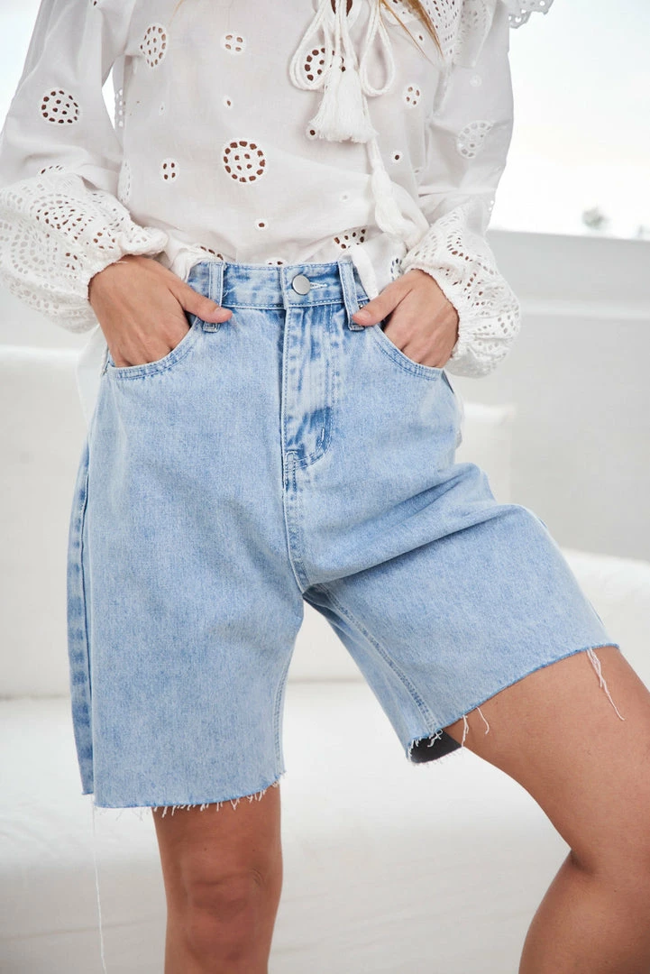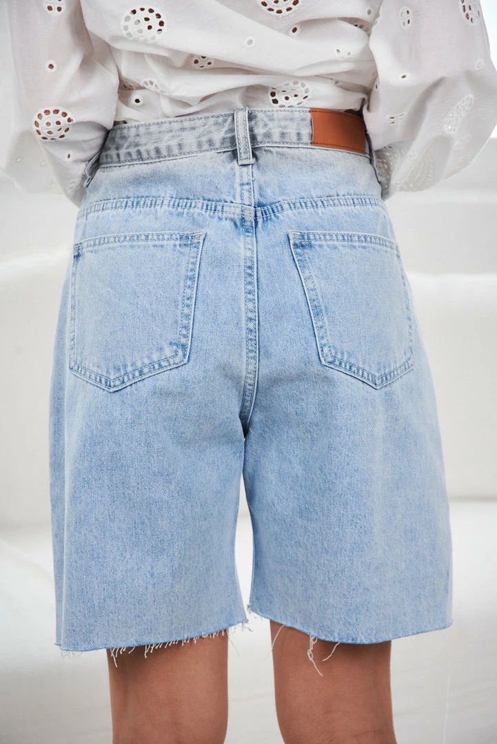 Our Hannie Shorts come in a light blue denim tone. They feature belt loops on the waist, pockets on the front side, and a zipper at the front. These shorts are perfect for the warm summer months!