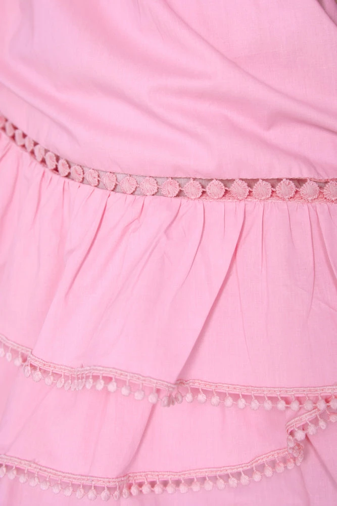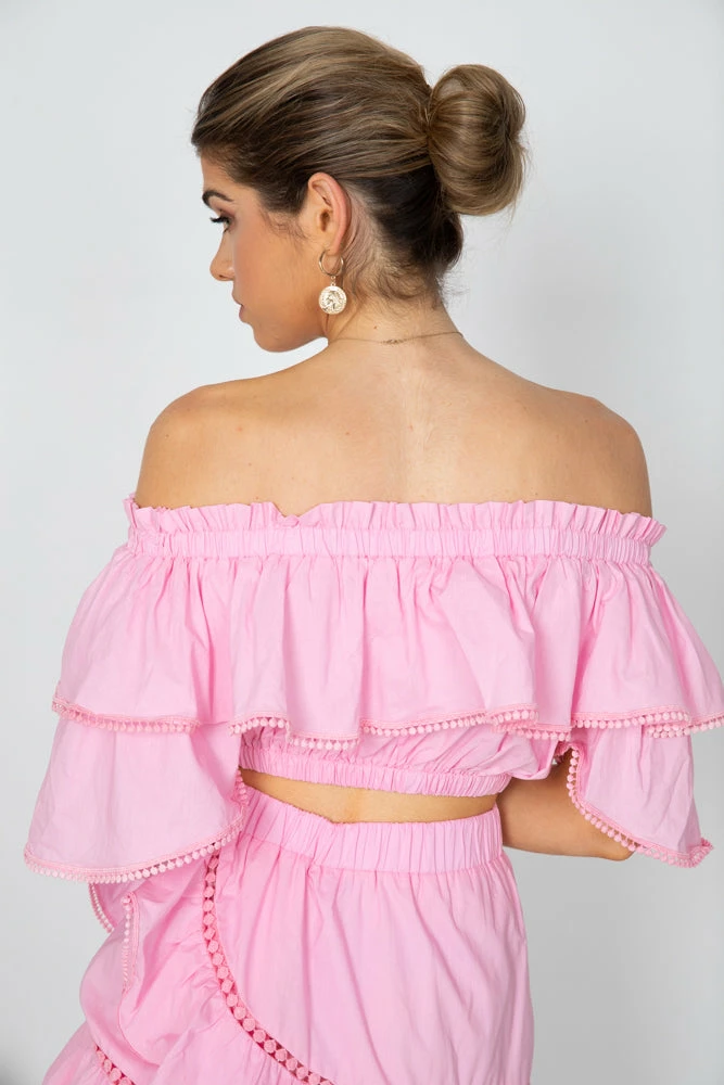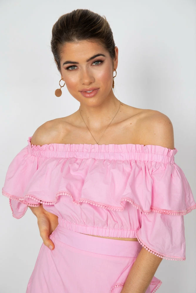 Our Lisea Top comes in a sweet blush tone. This features an elastic shoulder strap that can be worn on or off the shoulder. This features layered fabric, short sleeves, and a cinched waist. This feminine crop is beautifully vibrant and wears like a fantasy.