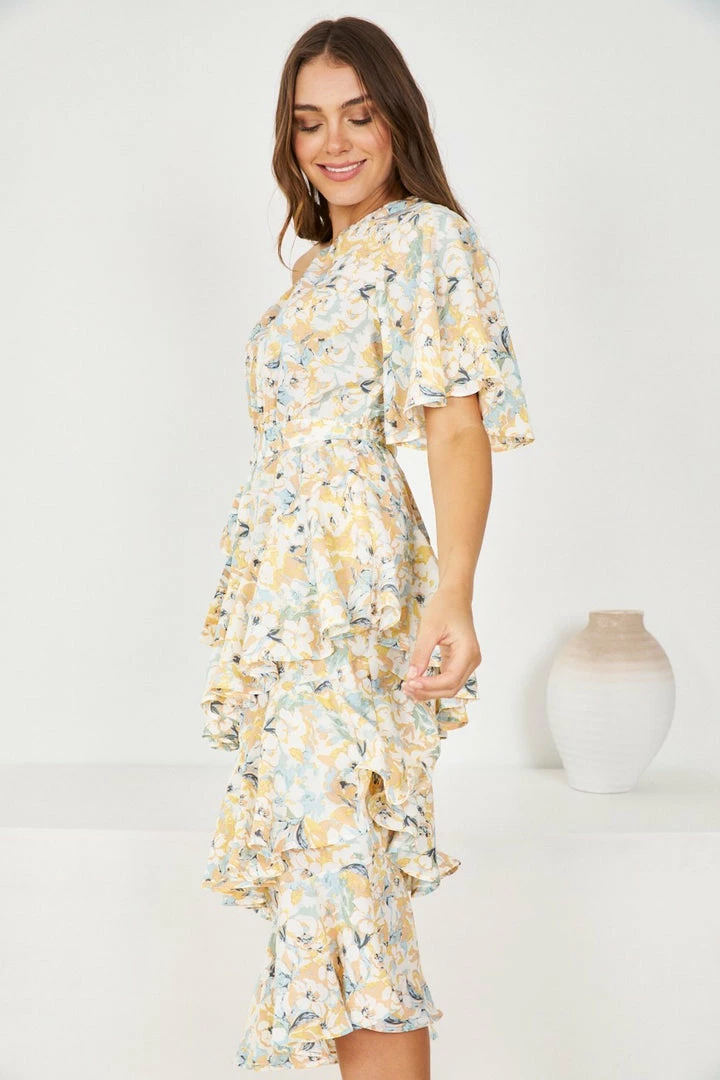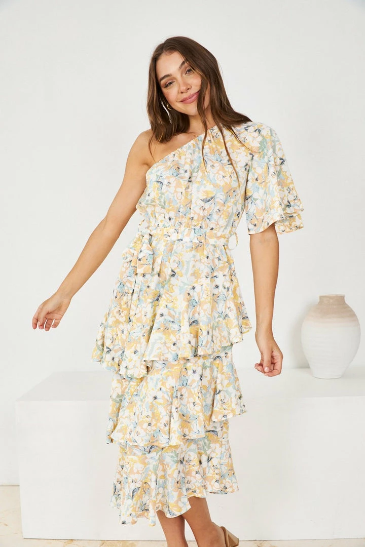 Our Annmarie Dress comes in tones of beige, blue, sage, and white floral print. This dress features a one-shoulder, butterfly sleeve, and has a tiered skirt. This flowy midi pairs beautifully with straps or heels for a stunning seasonal look!