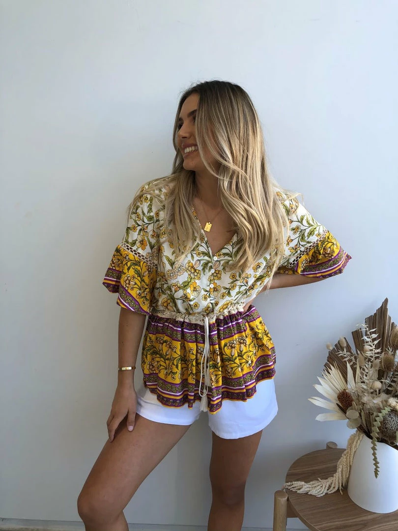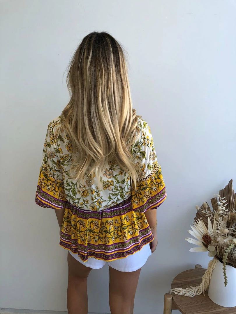 Our Domo Top is a vintage yellow, olive, dark mustard, purple & cream toned floral print blouse featuring a v neckline and buttons on the front making this an ideal maternity top. The crochet detailing on the sleeve and waist with tassel detailing are gorgeous bohemian additions that compliment the relaxed silhouette of this top.