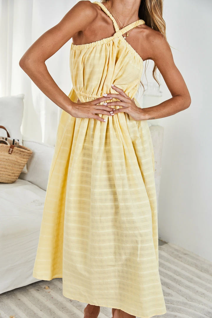Our Janah Dress comes in a bright yellow colour. This features a cross neckline, shirred bodice, an elastic waistband, and gathered fabric which give this dress a flowy skirt. This flowy dress is an eye-catcher this summer season!