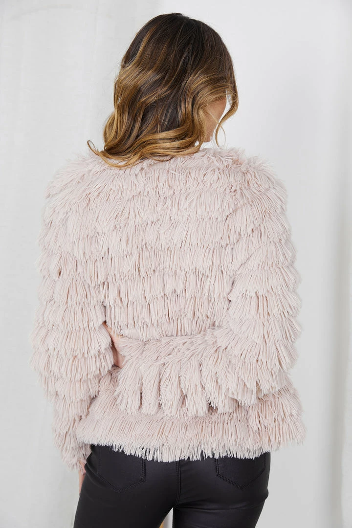 Our Ophelle Jacket comes in a mellow beige colour. Discovering a fabulous and stylish state of mind in this long sleeve fluffy jacket that does its work in both style and function departments. It features an open front to show off your statement inner top!