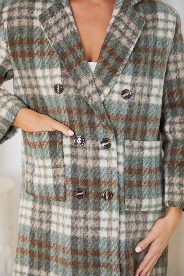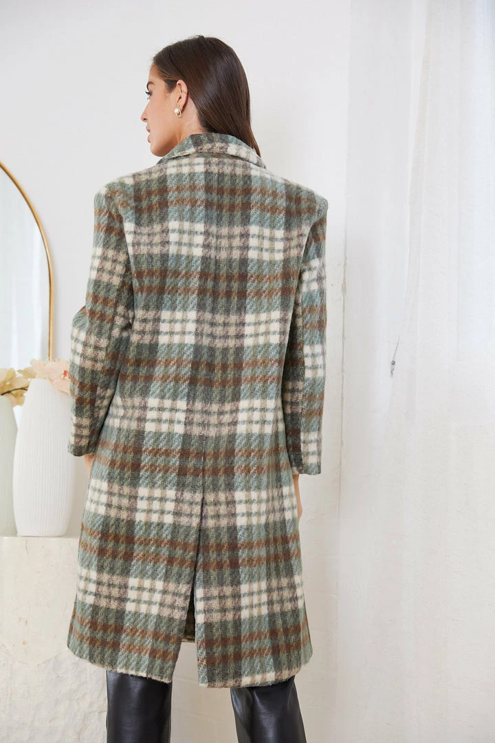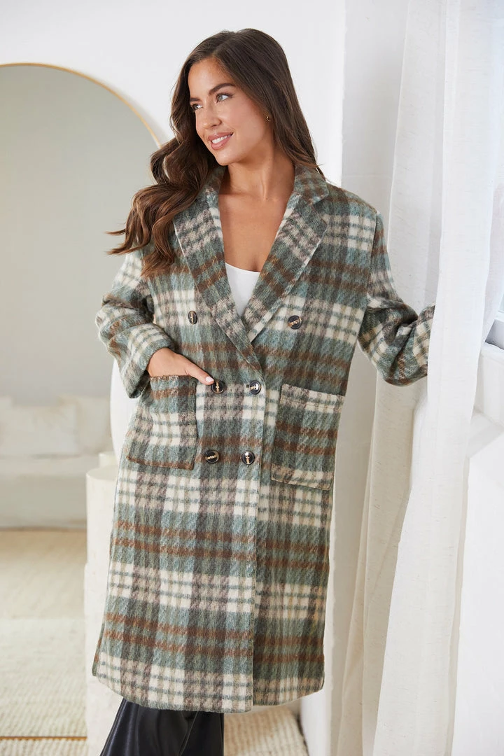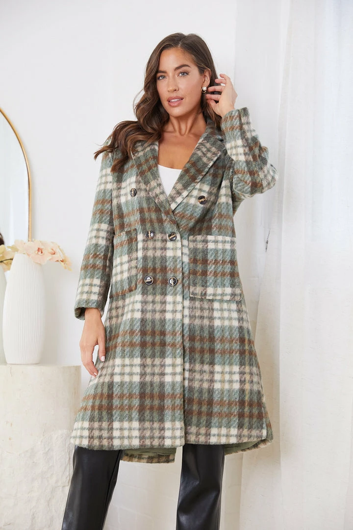 Our Paislee Coat comes in a sage green base with check print in shades of brown and cream. Spice up a plain outfit with this captivating outerwear that features a notched lapel collar, mid front buttons, long sleeves and side patch pockets. Look amazing by wearing this over our Tasanee Pants – Black & Charmaine Singlet – White!