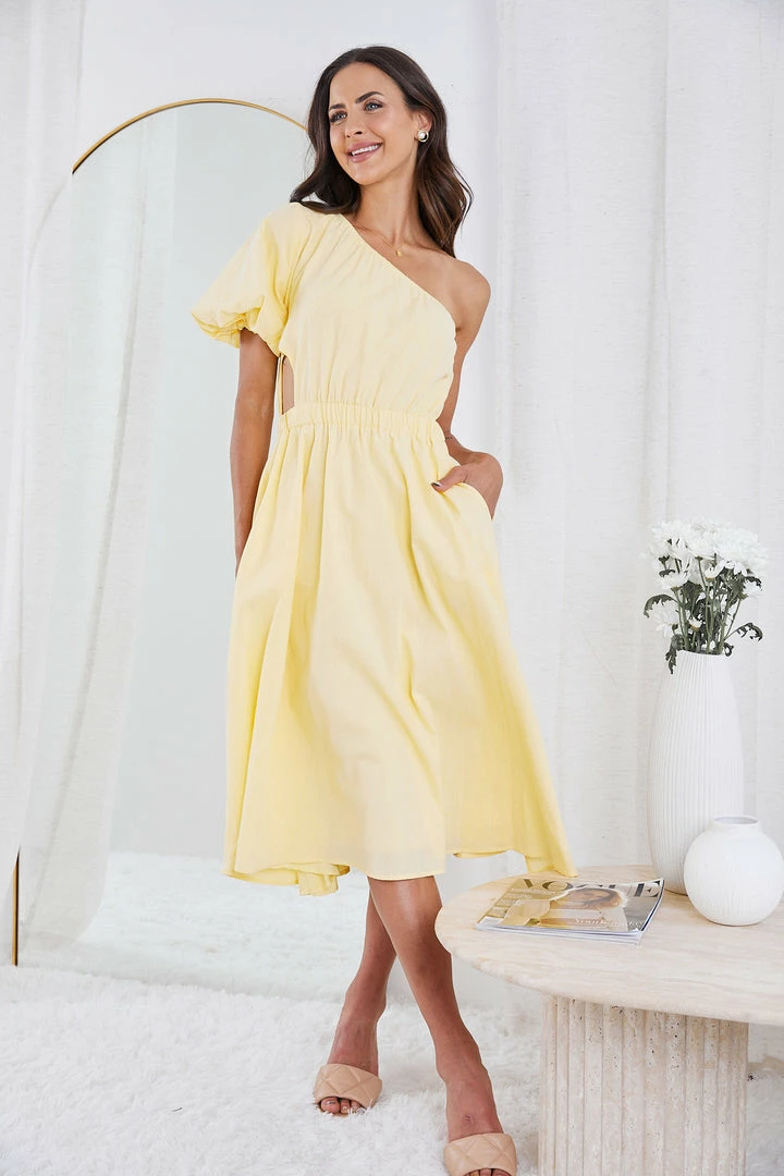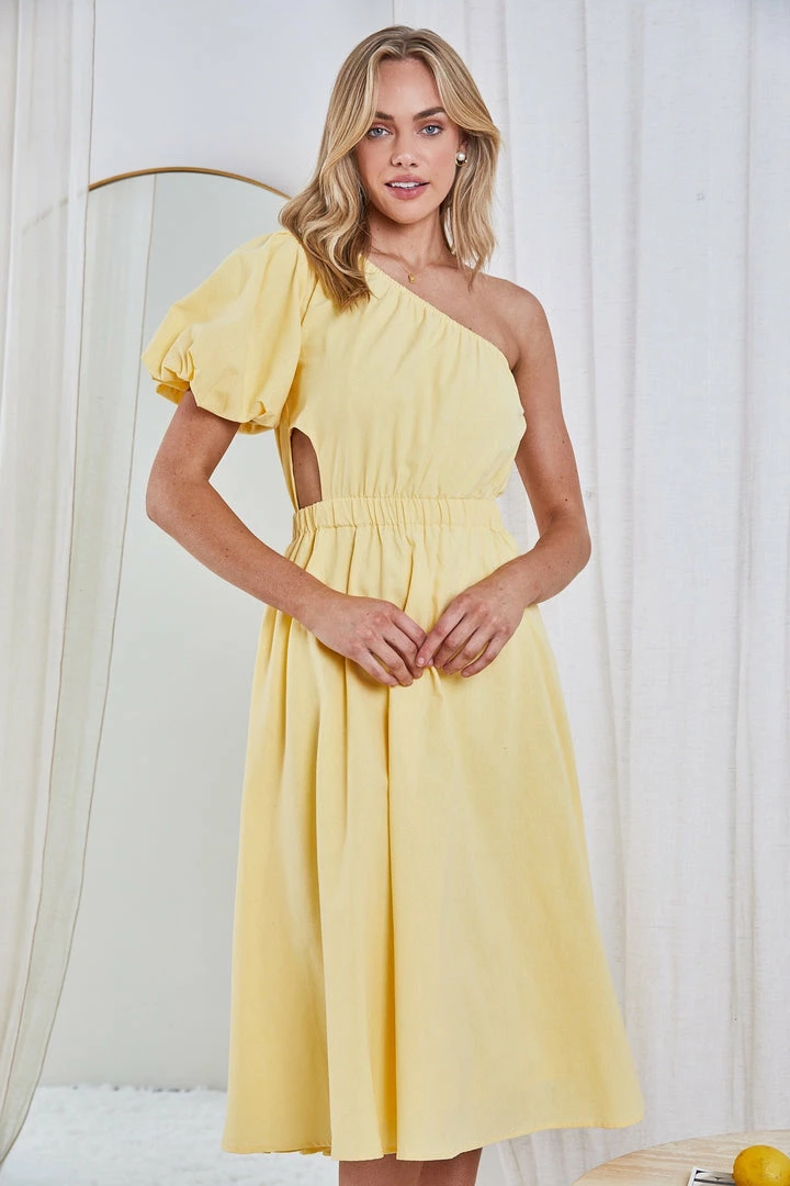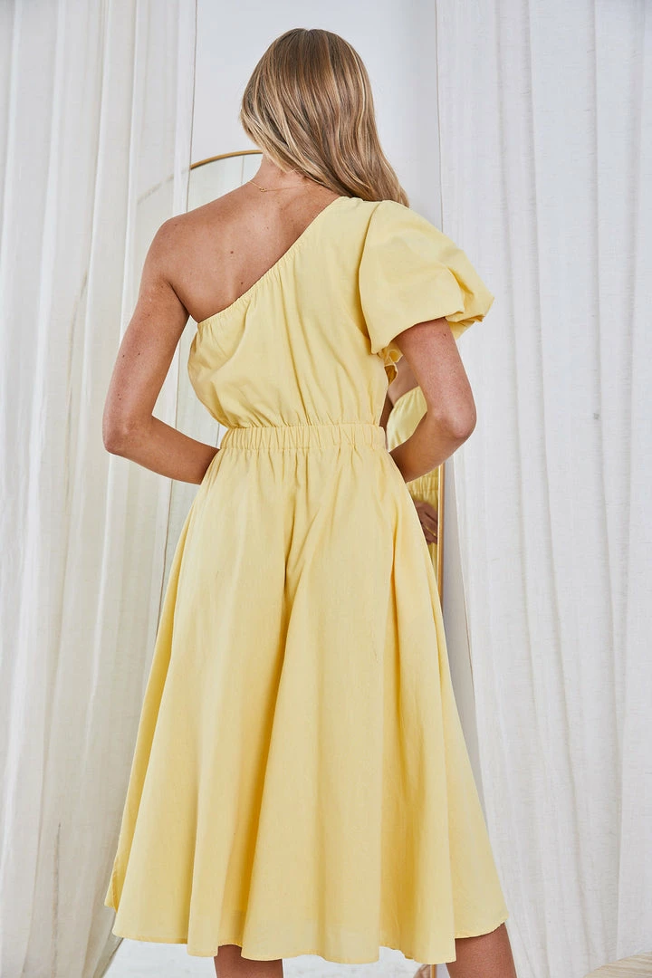 Our Perlita Dress is made from fine cotton fibers and finished in a bright shade of yellow, this dress will be a unique and luxurious addition to your summer wardrobe. This midi features a one shoulder, short sleeve cinched above the elbow, cinches in at the waist and falls to an easy length that looks chic with sandals.