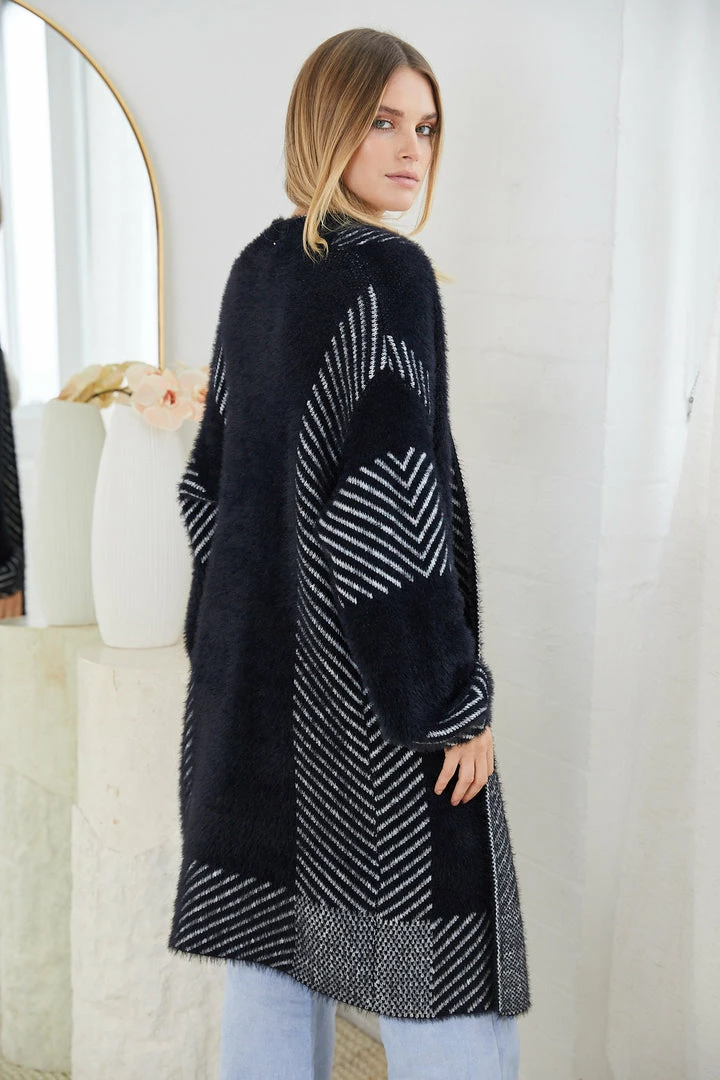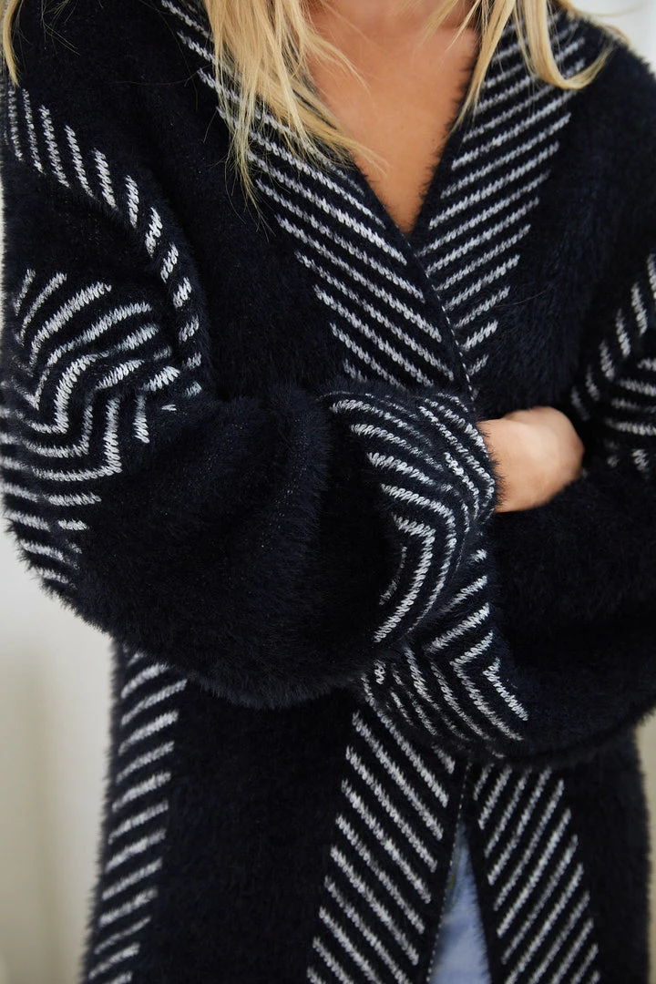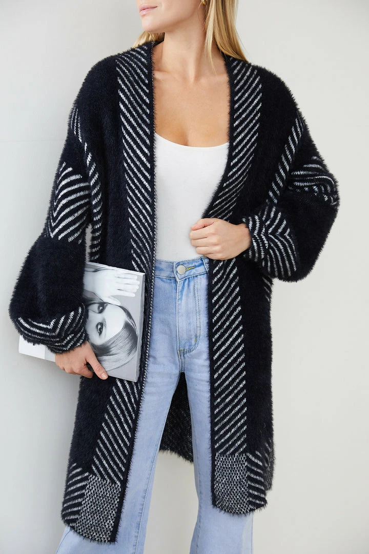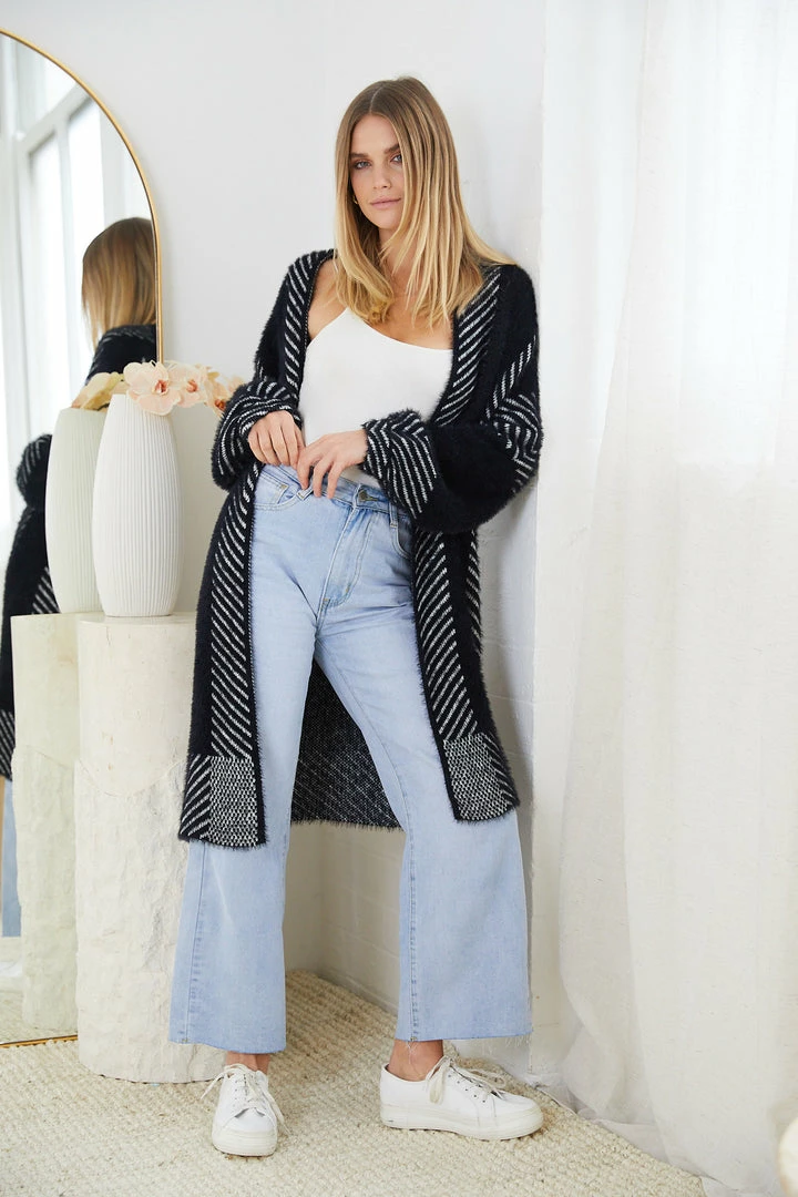 Our Tima Cardigan comes in a deep black base with white tone line prints. Feel like you’re wrapped up in bed with your heater on in this long sleeved knit cardigan that features an open front and a knee-length hem. It perfectly wears as a layer for our Charmaine Singlet – White and Gigi Jeans – Light Blue!