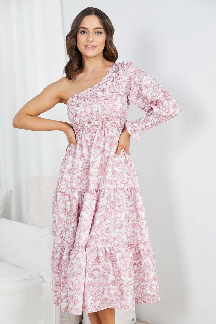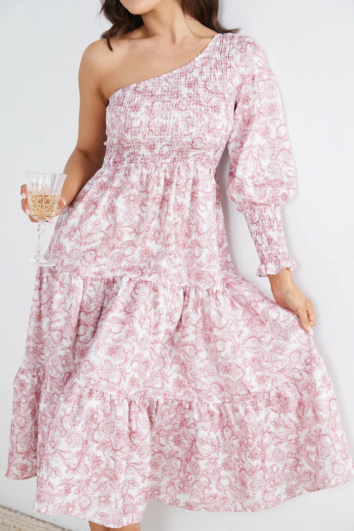 Our Alarica Dress comes in a white base with burgundy paisley print. This midi features a one shoulder, long sleeve that is cinched at the cuff, comfortable shirred bodice and a tiered skirt. This pairs beautifully with sandals and silver accessories, perfect for any occasion.