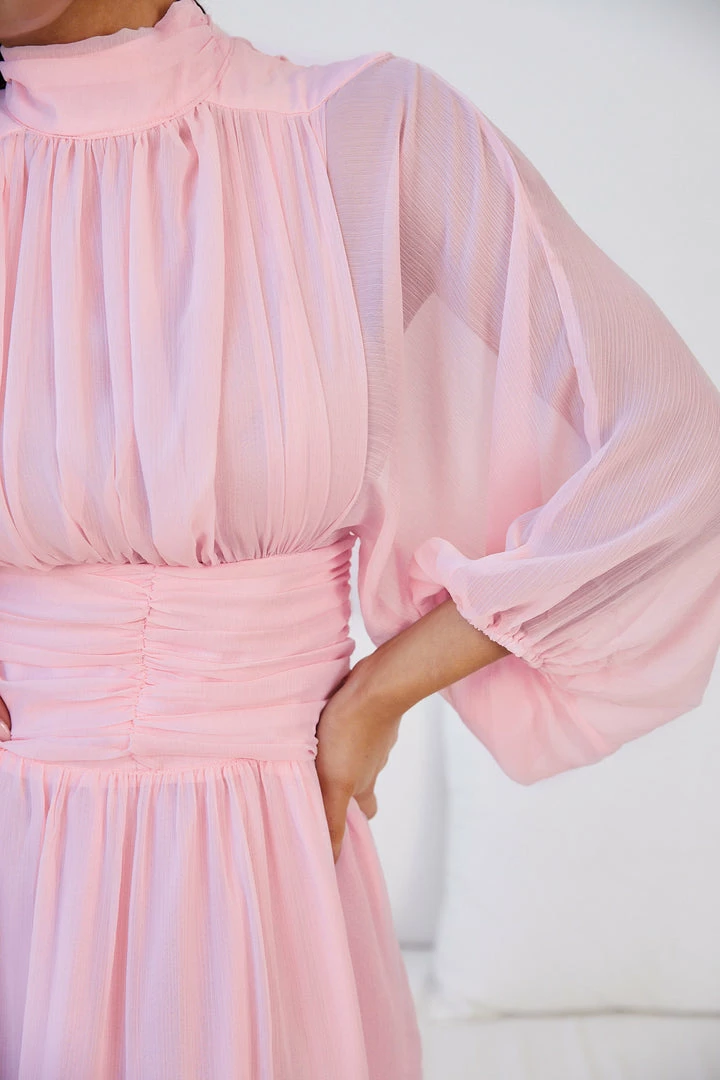 Our Analey Dress comes in a light pink colour. Be red carpet ready in this long exquisite dress that features a high neckline, long sleeves elasticated at the cuff, maxi length hemline, invisible zipper at the back and ruched detailing on the bodice and waist hugging your shape at the right places. Put on a smokey make up and pair with a minaudiere bag for your next soiree.