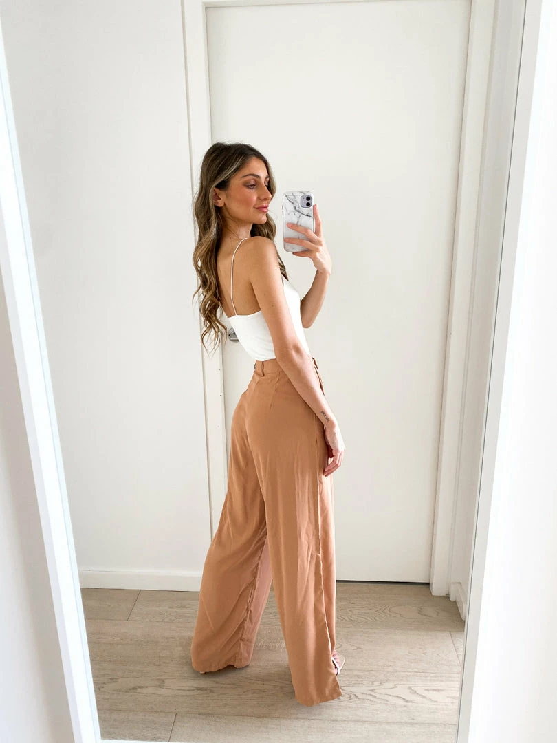 Our Clemency Pants come in a classic neutral beige tone. They feature a midi length, pockets on the front sides, and belt loops around the waist. These versatile pants pair wonderfully with so many styles!