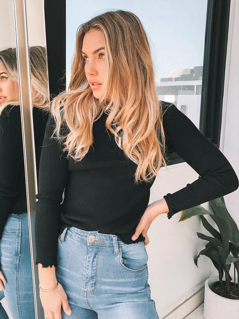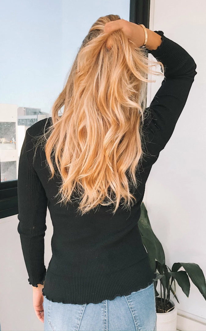 Our Chanting Top is a basic black tone. It’s a light weight material ideal for layering and is a perfect winter essential. The high frill neckline, hemline & cuff detail is a feminine feature of the otherwise simple top. The textured knit material moulds to the body making this a comfortable addition to the wardrobe that can be dressed up with a camel midi skirt, worn for work or dressed down with your fave pair of mum jeans & white sneakers.
