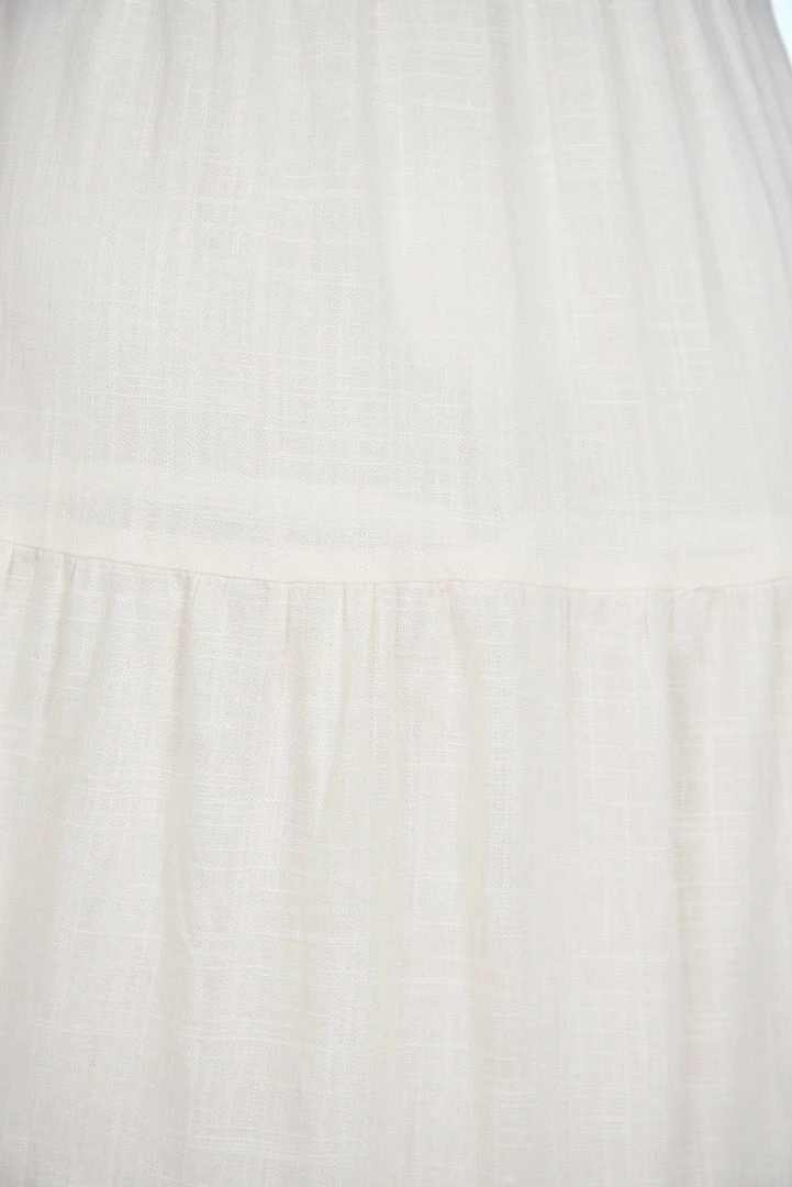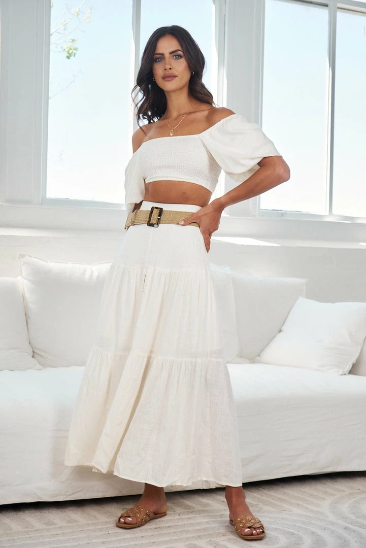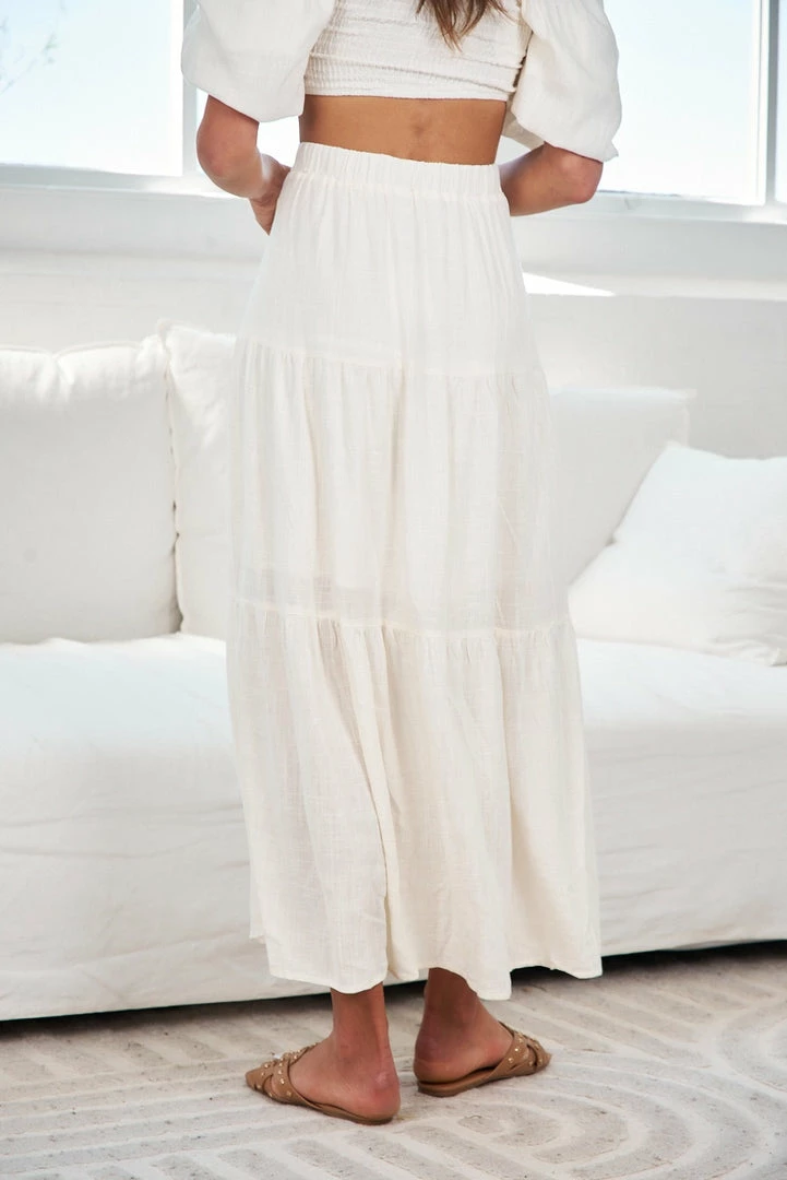 Our Jayma Skirt comes in a warm white tone. It features a midi length, and pairs beautifully with our Jayla Top for an effortless casual look this spring season!
