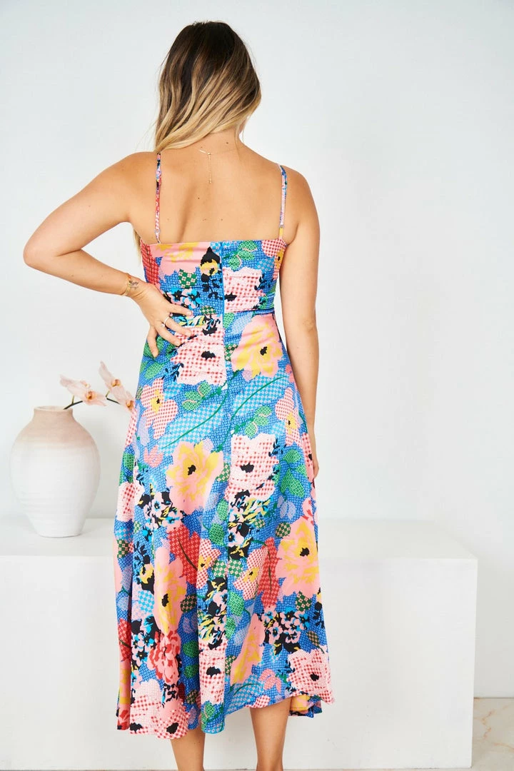 Our Karago Dress is a deep blue base with teal, red, peach, yellow, green, navy, black, lilac & cream coloured floral print. This textured printed midi comes in a lightweight non-stretch fabrication that you’re sure to love during the warmer months. The gorgeous tie up bust and easy adjustable spaghetti straps are feminine & comfortable additions to this garment. The skirt flows out making this ideal for maternity wear.