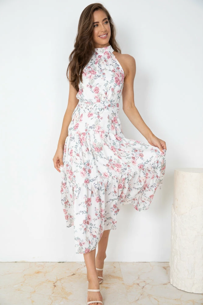 Our Kobi Dress is a gorgeous halter neck style maxi that comes in a pink-tone floral print. The frill hemline & fabric waist tie cinches the figure beautifully & is a lovely feminine addition to the wardrobe.