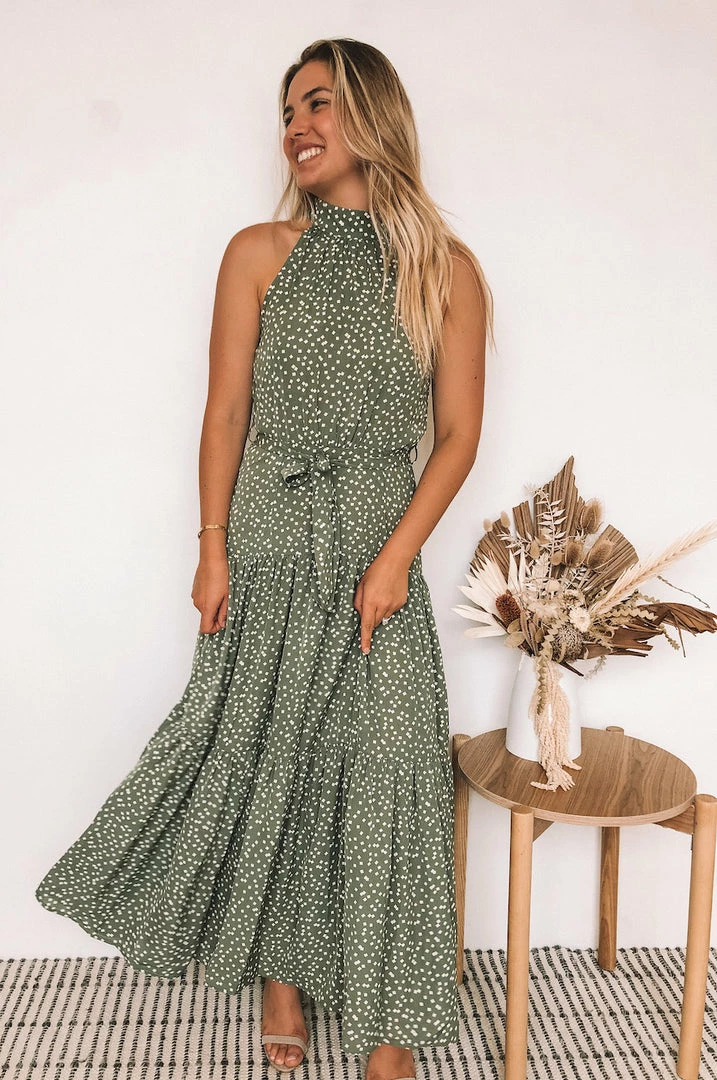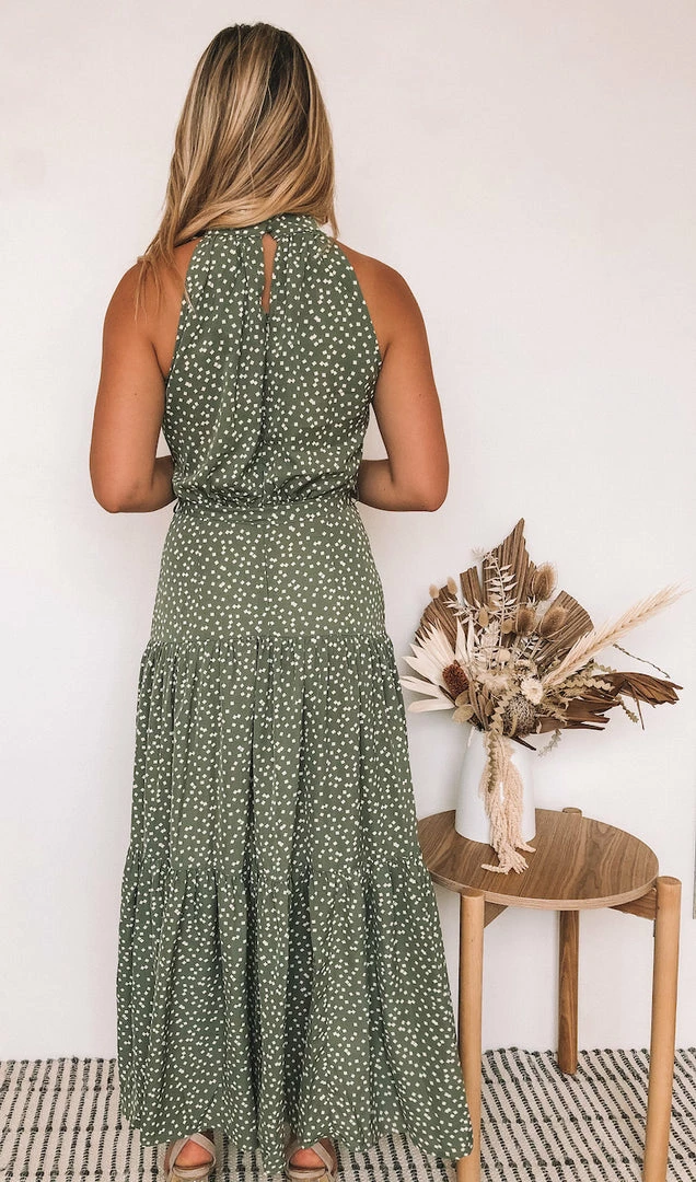 Our Tobi Dress is a gorgeous halter neck style maxi that comes in a delicate sage tone featuring a square spot white print. The frill hemline & fabric waist tie cinches the figure beautifully & is a lovely feminine addition to the wardrobe.