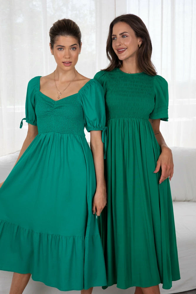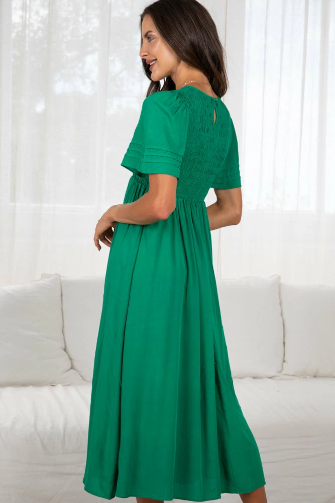 Our Iolana Dress comes in a lovely earthy green tone. The midi features a round neckline, short sleeves and textured shirring across the chest. This stunning midi pairs wonderfully with sandals or heels for a stunning formal look!