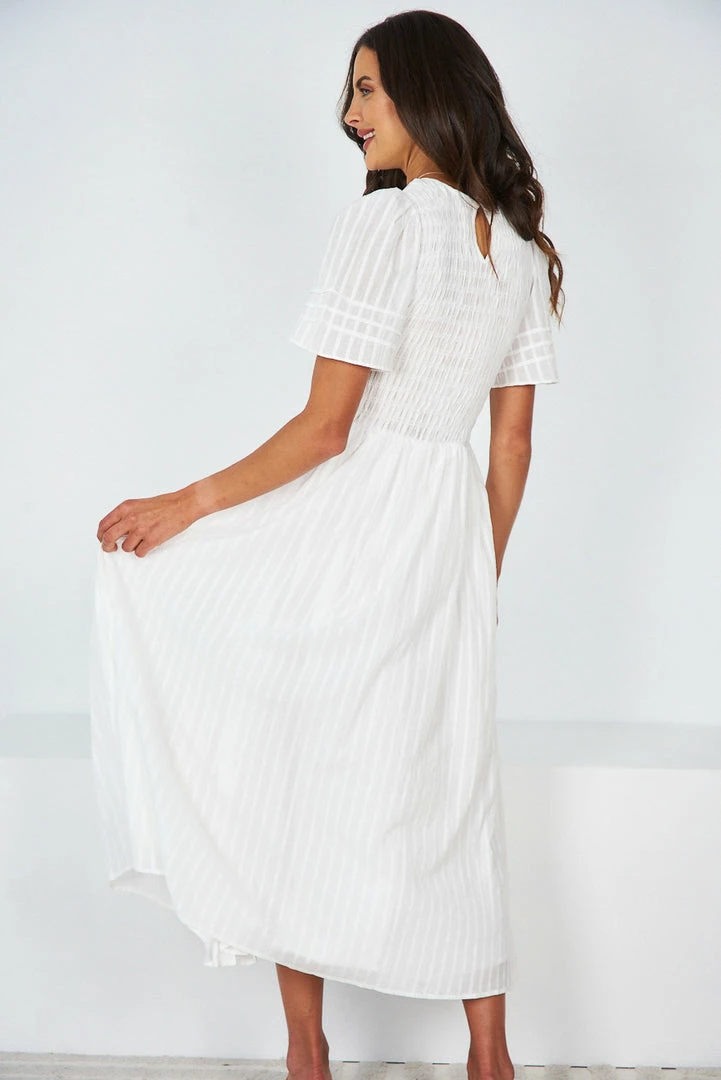 Our Iolana Dress comes in a crisp white tone. It features a round neckline, short sleeves and a textured pattern across the chest. This stunning midi pairs wonderfully with boots or heels for a stunning formal look!