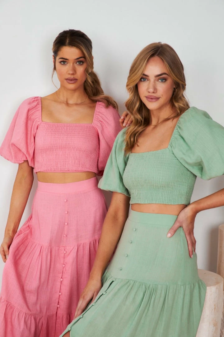 Our Jayla Top comes in a lovely pink tone. It features a cropped length, round neckline & short sleeves. This cropped top pairs beautifully with basic pants or our Jayma skirt for an effortless casual look this spring season!