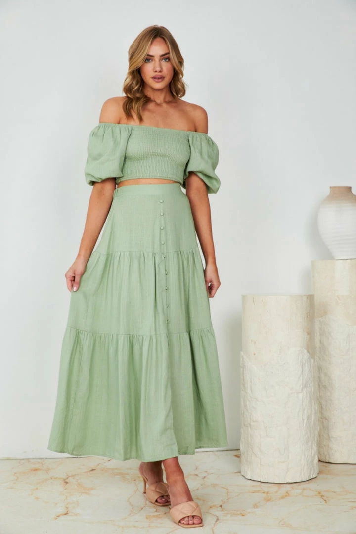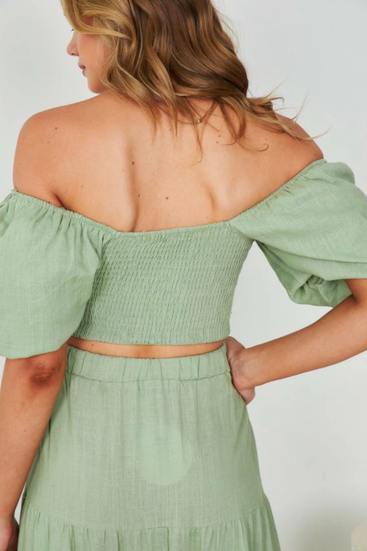 Our Jayla Top comes in a soothing sage tone. It features a cropped length, square neckline & short sleeves. This cropped top pairs beautifully with basic pants or our Jayma skirt for an effortless casual look this spring season!