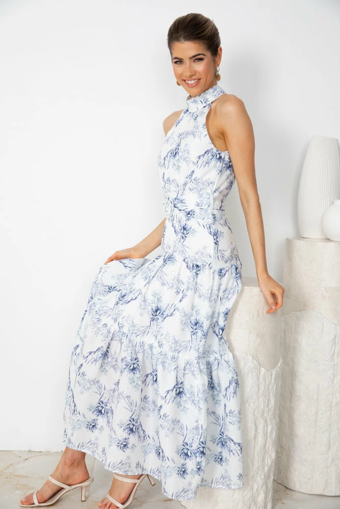Our Kobi Dress is a gorgeous halter neck style maxi that comes in a blue-tone floral print. The frill hemline & fabric waist tie cinches the figure beautifully & is a lovely feminine addition to the wardrobe.