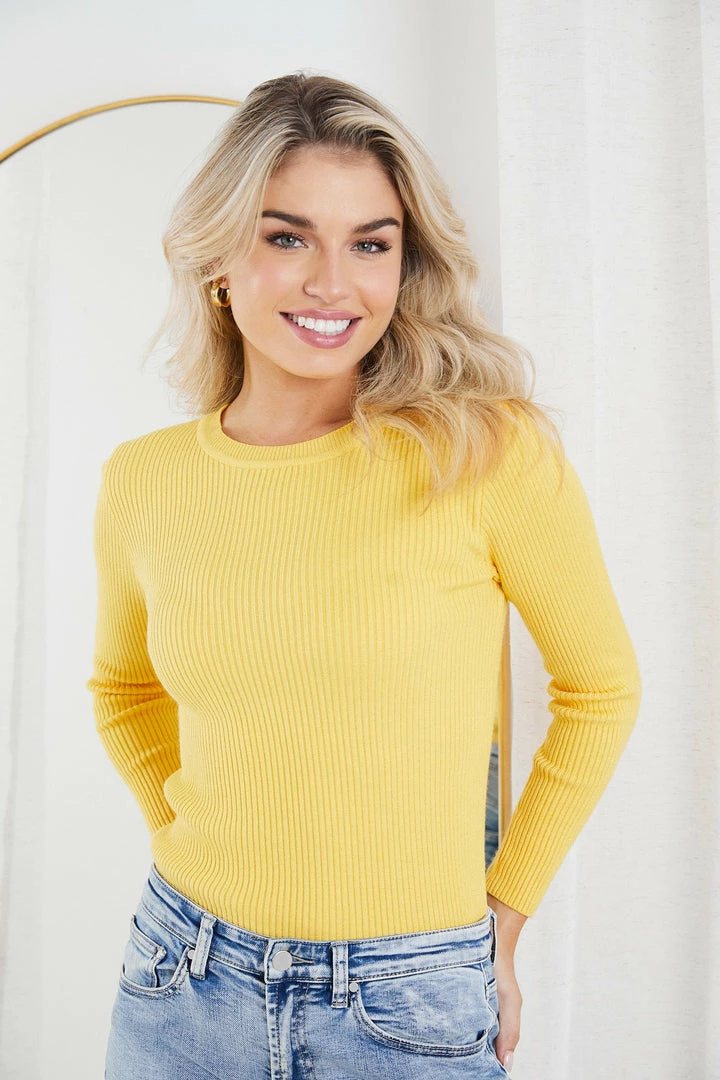 Our Basa Top comes in a mustard tone color. It features a round neckline, long sleeves and a textured knit pattern all over the garment. This cute knit is perfect for the colder months ahead!