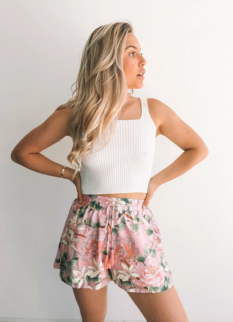 Our Kimmie Shorts are a gorgoues baby pink colour with a fun floral pattern overlaid. These mini’s are the perfect pop of colour to add to your summer wardrobe and are best paired with the matching Kimmie Kimono.