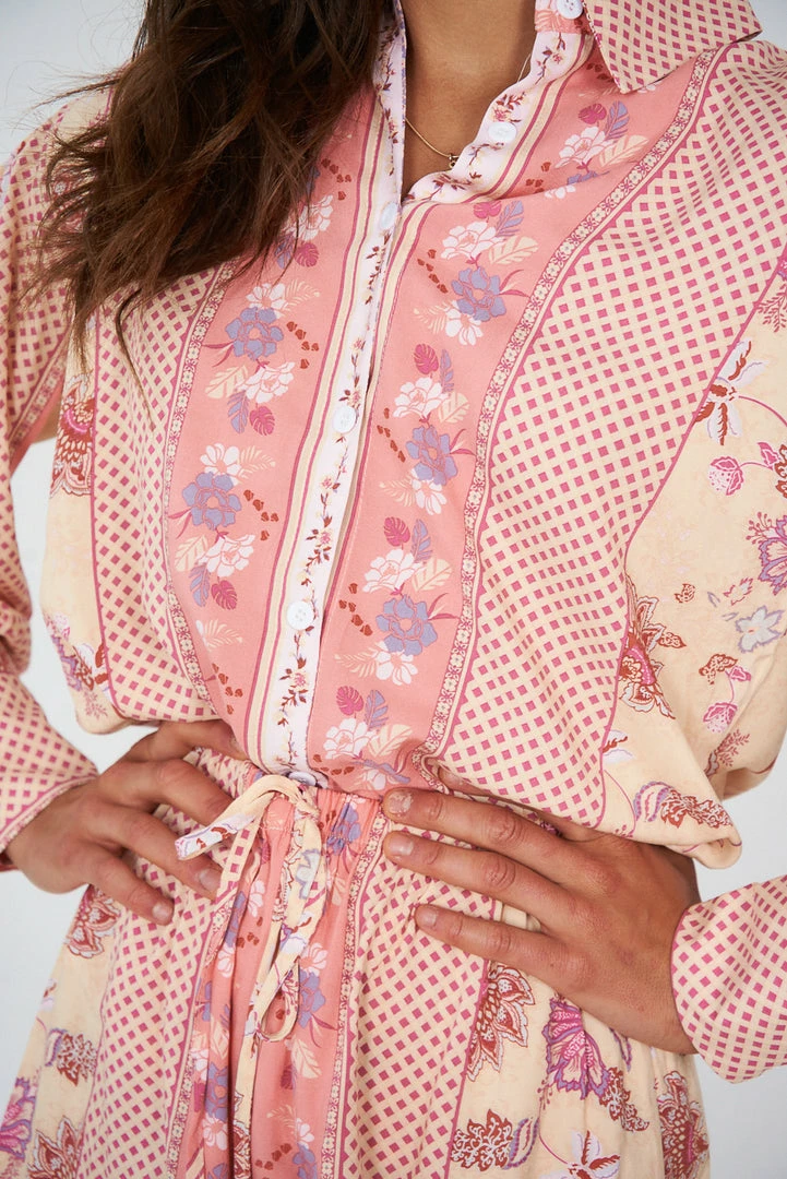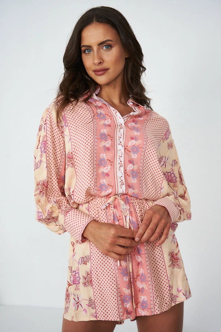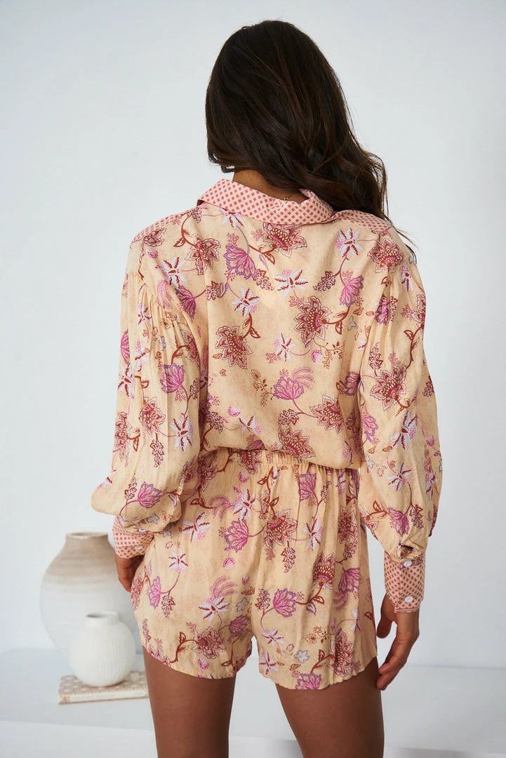 Our Delicia Set comes in a pink & gold tone base, with a burgundy, white & purple tone print. This beautiful set consists of a long sleeve, buttoned top and the perfect mini length shorts for pairing. This set is the perfect piece for the warm spring months!