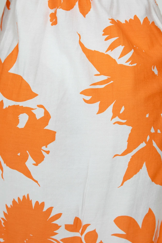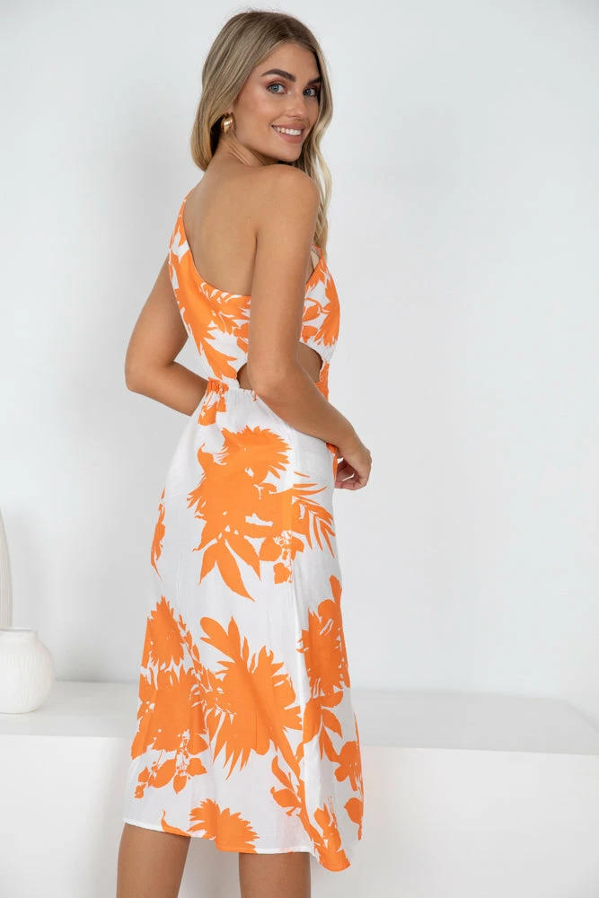 Our Kindly Dress comes in a classic white tone base with an orange tone floral print. This midi features a one-shoulder, asymmetric neckline, cut out on the side of the waist, and a flowy skirt. She pairs beautifully with white flats for an off-duty look.