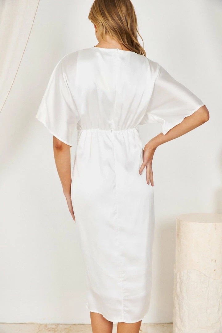 Our Rosemary Dress comes in a crisp white tone. It features a v neckline, short relaxed sleeves, and a tie at the front. This flowy midi pairs beautifully with heels for a gorgeous seasonal look!