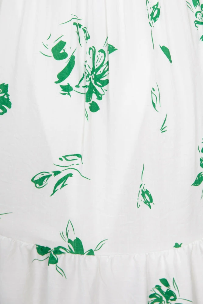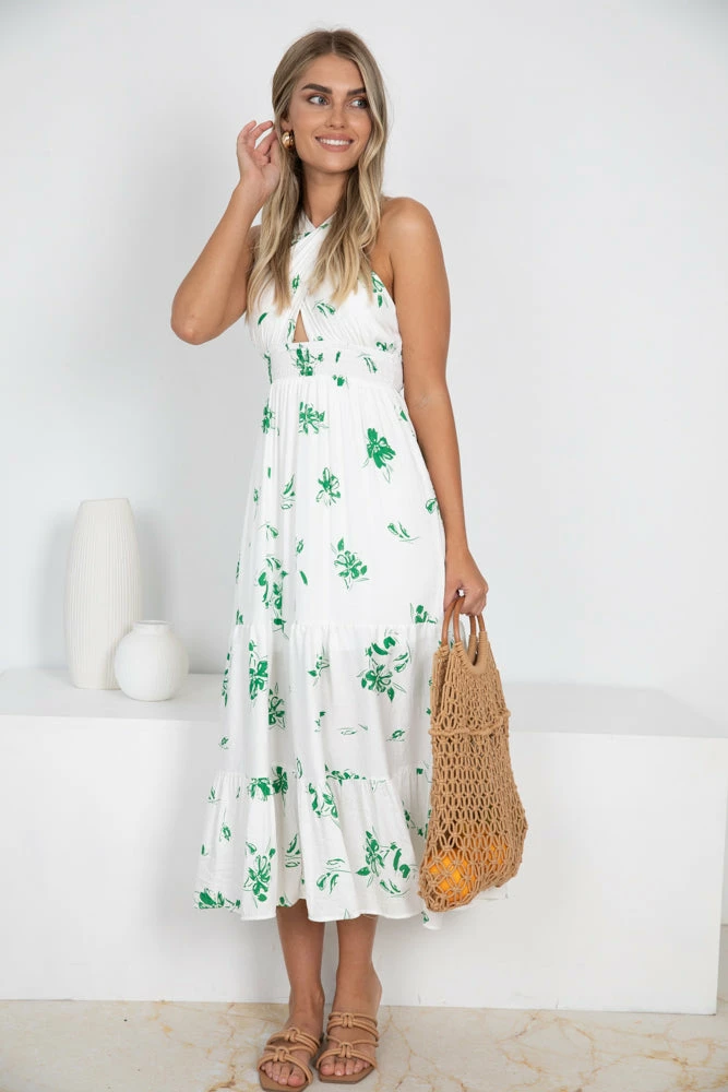 Our Snacked Dress comes in a pleasant white tone base with green leaves print. This midi features a cross-over halter neckline, flexible waist, perfect for a precious growing baby bump, and a tiered flowy skirt with gathered fabric detailing are a lovely addition to this piece.