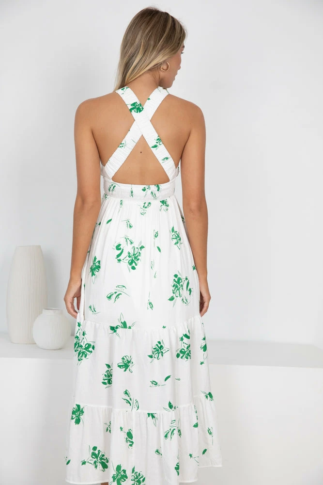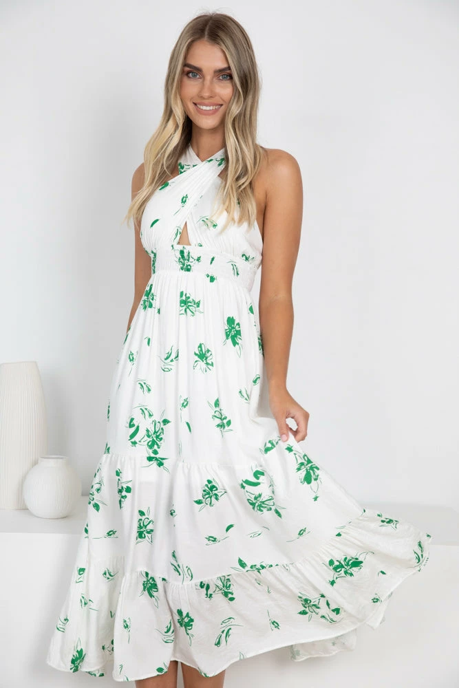 - Key Features: Midi length. Elasticated waistline. Cross over halter neckline. Flowy skirt with gathered fabric details. Maternity Friendly.