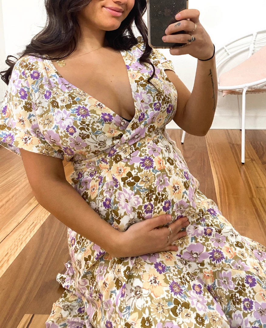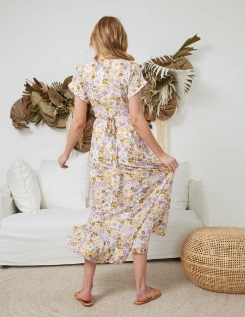 Our Tangerine Dress is a white tone base with a lilac and gold tone floral print. This wrap dress oozes femininity and is sure to put a hop in your step. The V neckline makes this ideal for breastfeeding and the split on front with the rolled sleeves make this an item you can dress up with heels or down with sneakers.