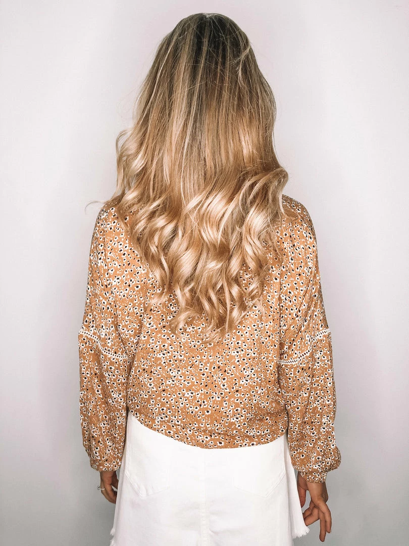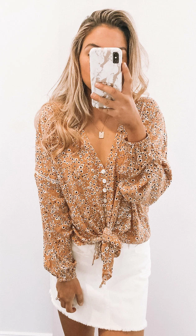 Our Easterly Top comes in the same gorgeous mustard print as the Etsy collection. It’s a gorgeous lightweight material ideal for the warmer months to come. The v neckline and buttons on front make this ideal for breast feeding. The front hemline features a tie detail adding whimsy to this garment. The relaxed long sleeves feature lace detailing making this a fun addition to your wardrobe.
