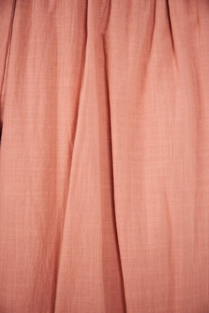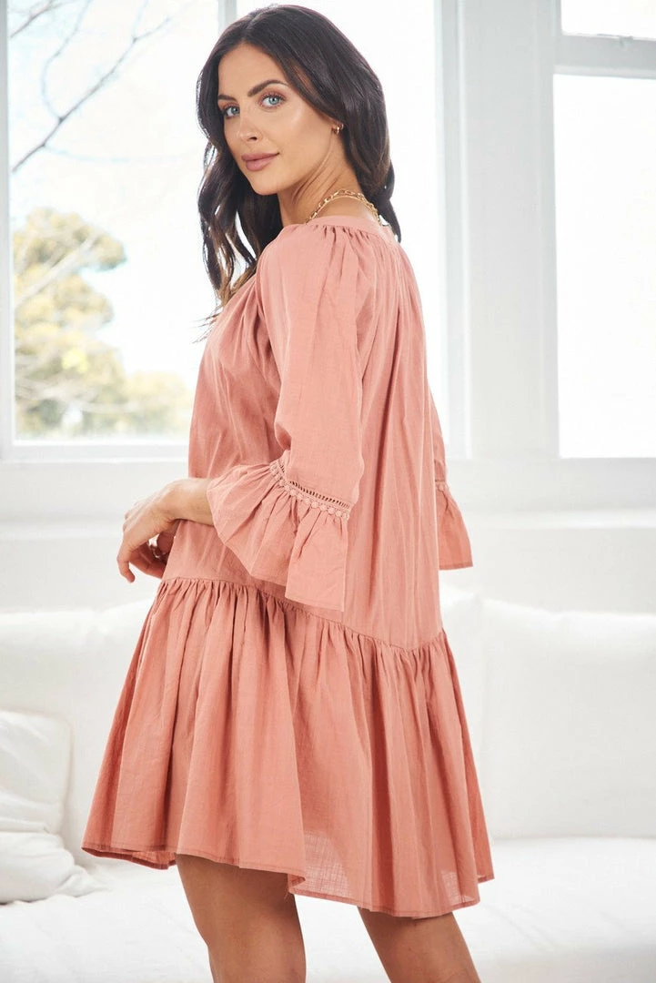 Our Our Idony Dress comes in a coral pink tone. It features a v neckline, short bishop sleeves, and an embroidered pattern down the front. This flowy midi pairs beautifully with heels for an effortless transseasonal look!