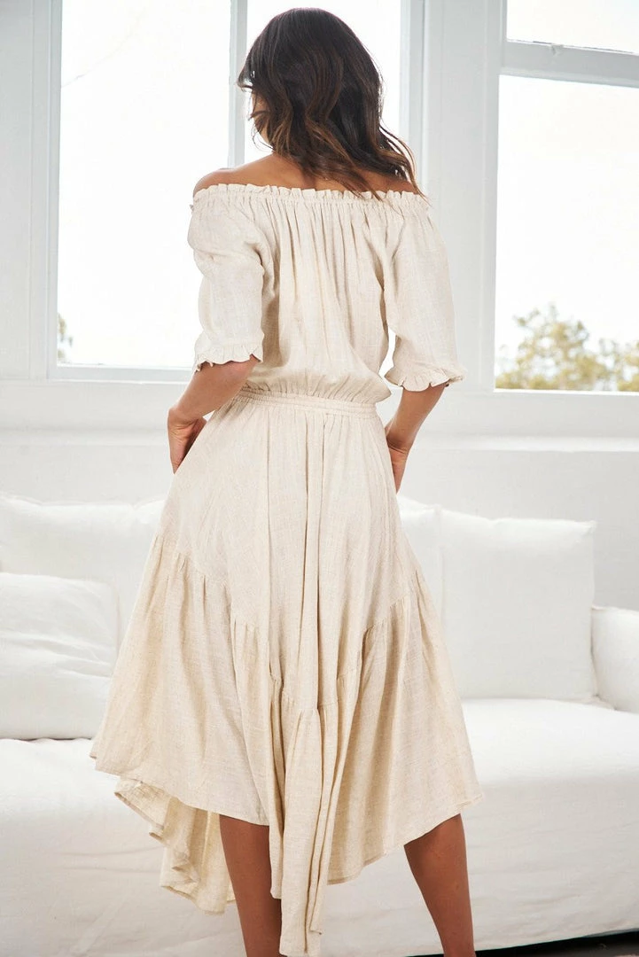 Our India Dress comes in a classic neutral beige tone. It features a v neckline, short sleeves, and a fabric drawstring to cinch in the figure beautifully. This flowy midi pairs beautifully with heels for a stunning transseasonal look!