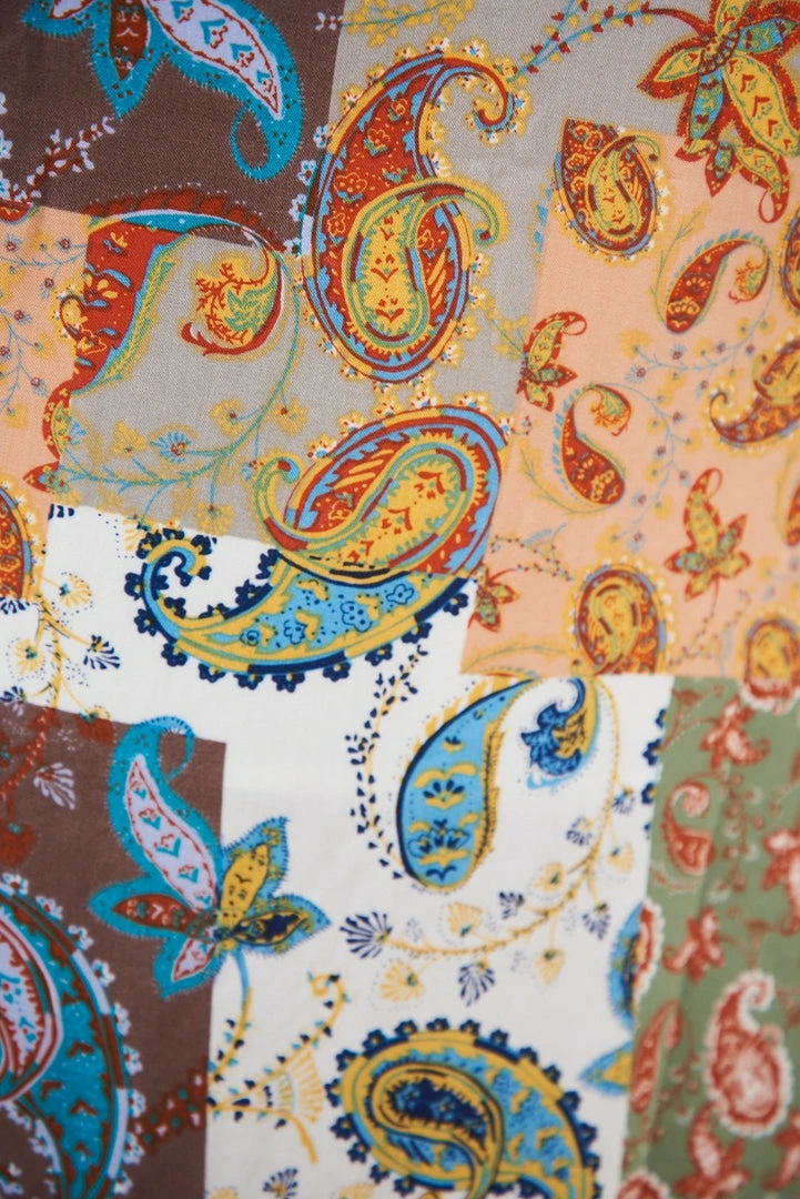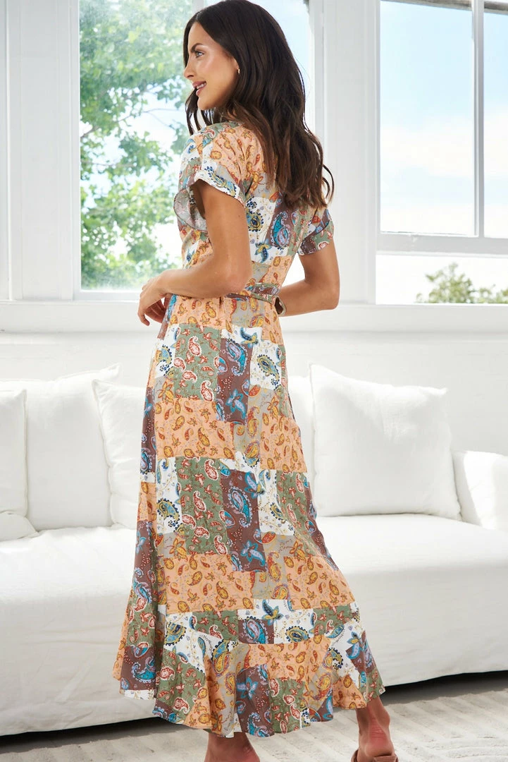 Our Tangerine Dress is a vibrant orange, white, sage and cinnamon toned patch paisley print. This wrap dress oozes femininity and is sure to put a hop in your step. The V neckline makes this ideal for breastfeeding and the split on front with the rolled sleeves make this an item you can dress up with heels or down with sneakers.