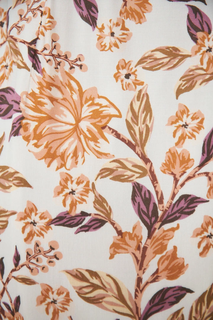 Our Zimma Dress is a white base with eggplant-purple, peach, olive, mocha, mustard & black-toned floral print. It’s a gorgeous lightweight material ideal for basking in the sun. The high low hemline, frill trimmings & butterfly sleeves are lovely feminine touches to this dress. The v neckline is great for showing of your stunning décolletage.