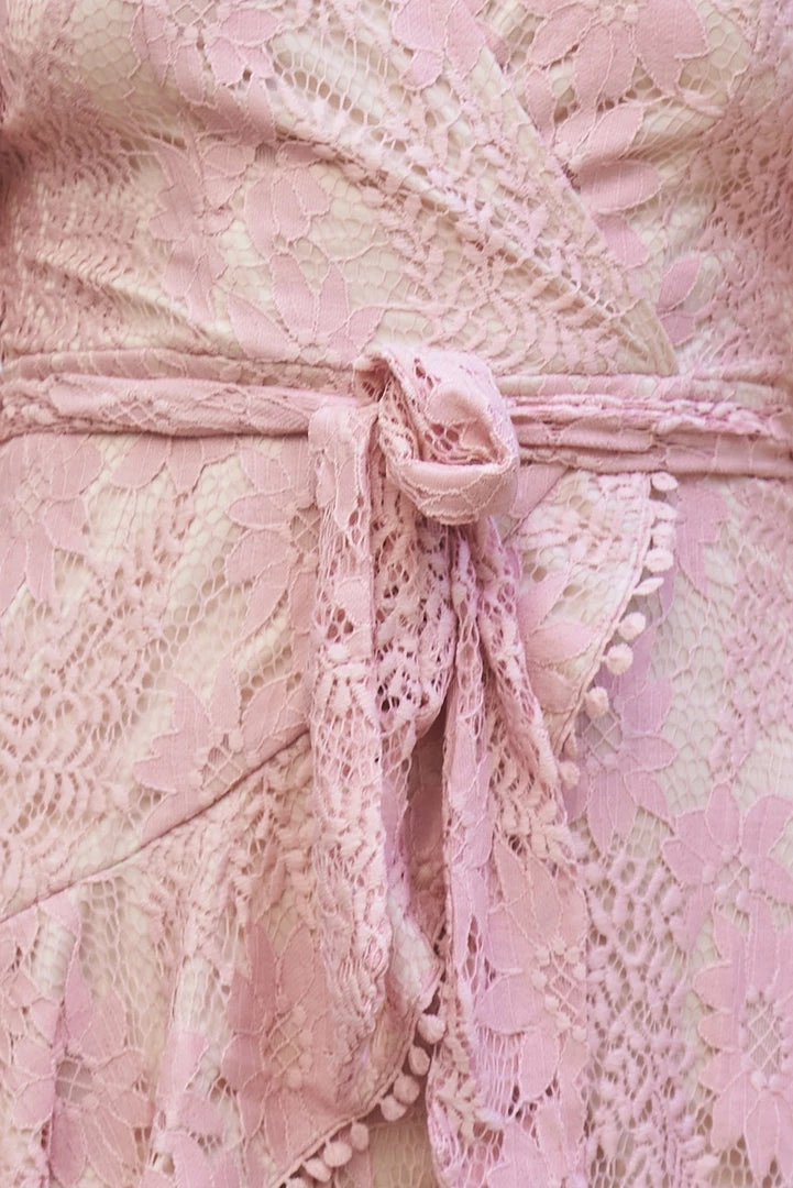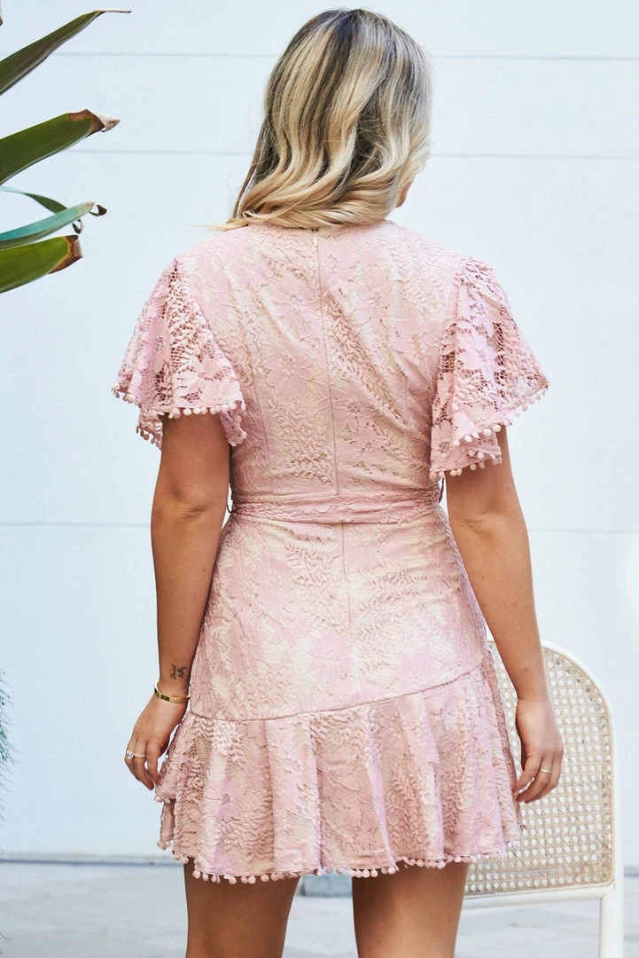 Our Malana Dress comes in a subtle pink blush tone. It features a v neckline, short sleeves, a fabric waist tie, and an embroidered floral pattern all over the garment. This stunning midi is the perfect dress for your next formal event!