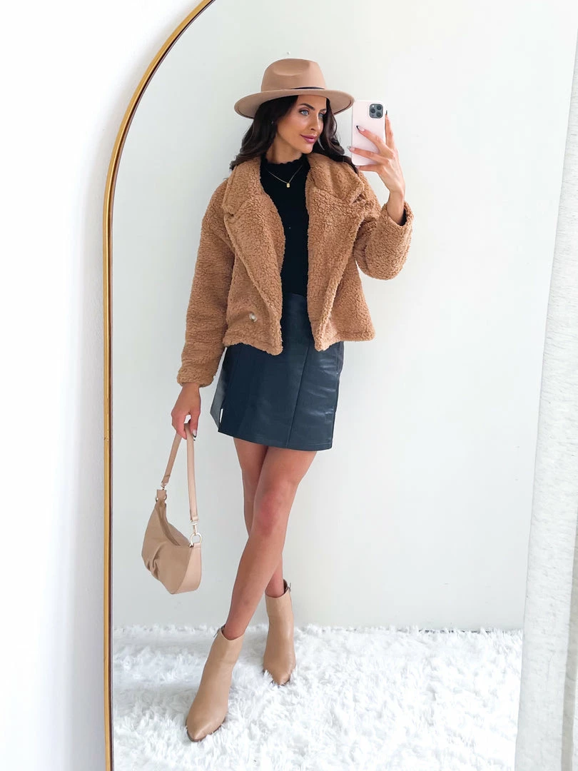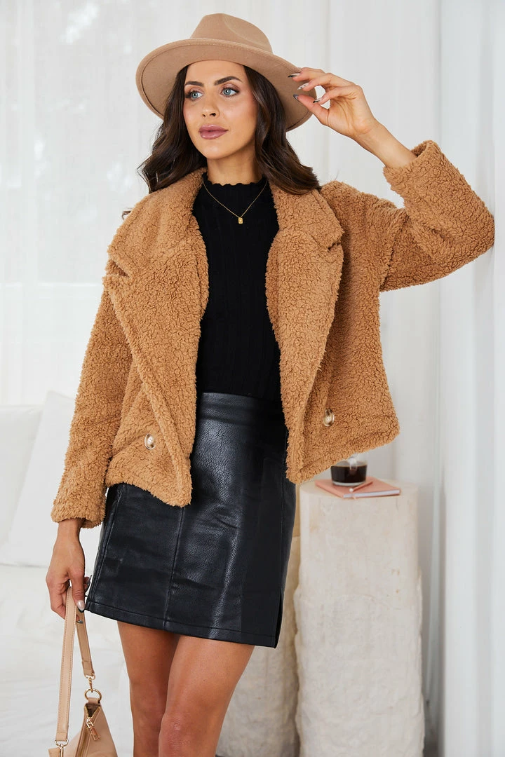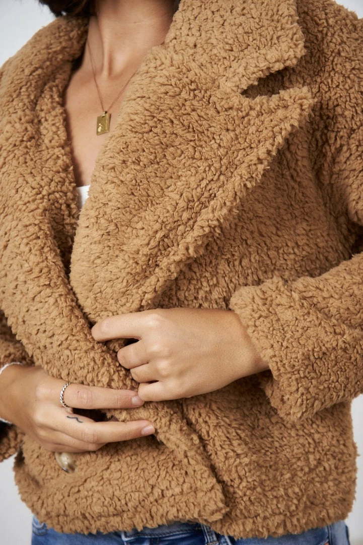 Our Gillian Jacket comes in a dark tan tone. It features oversized lapels, long relaxed sleeves and buttons on the front to close. This warm teddy jacket is the perfect outer layer for the cold winter months!