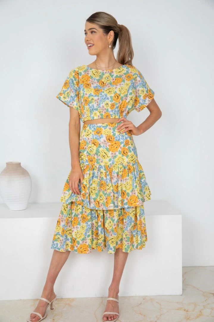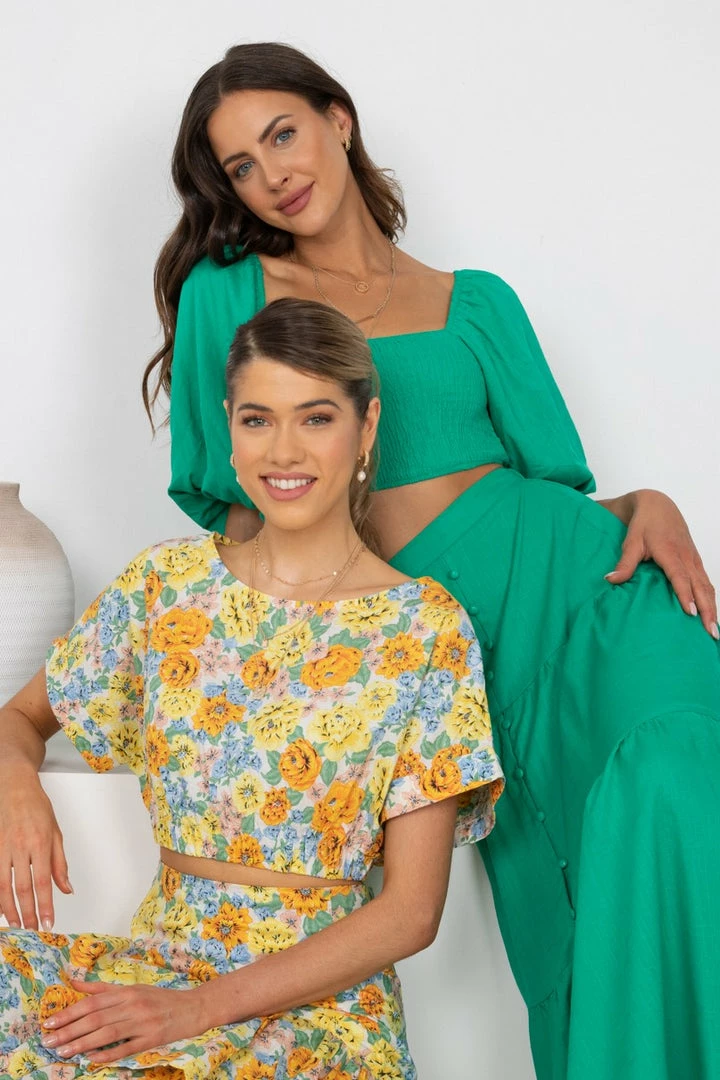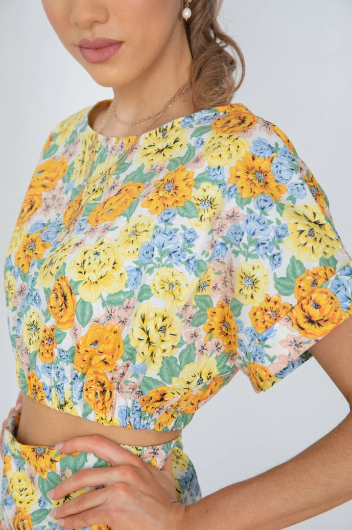 Our Loreta Top comes in a fabulous floral print. This crop features short sleeves, an elastic hem to cinch the waist, and a boat neckline. Complete the look with our Loreta skirt, sandals, and gold accessories for the perfect off-duty look!.