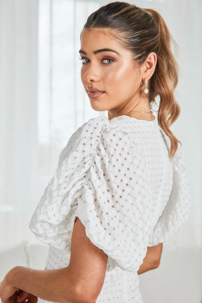 Our Ramosa Dress is classic white tone. This features a midi-length skirt, a high round neckline, a hidden zipper at the back, and beautiful puff short sleeves with tie details. Pair with your favourite heels and accessories, you’re sure to draw every eye in the room.