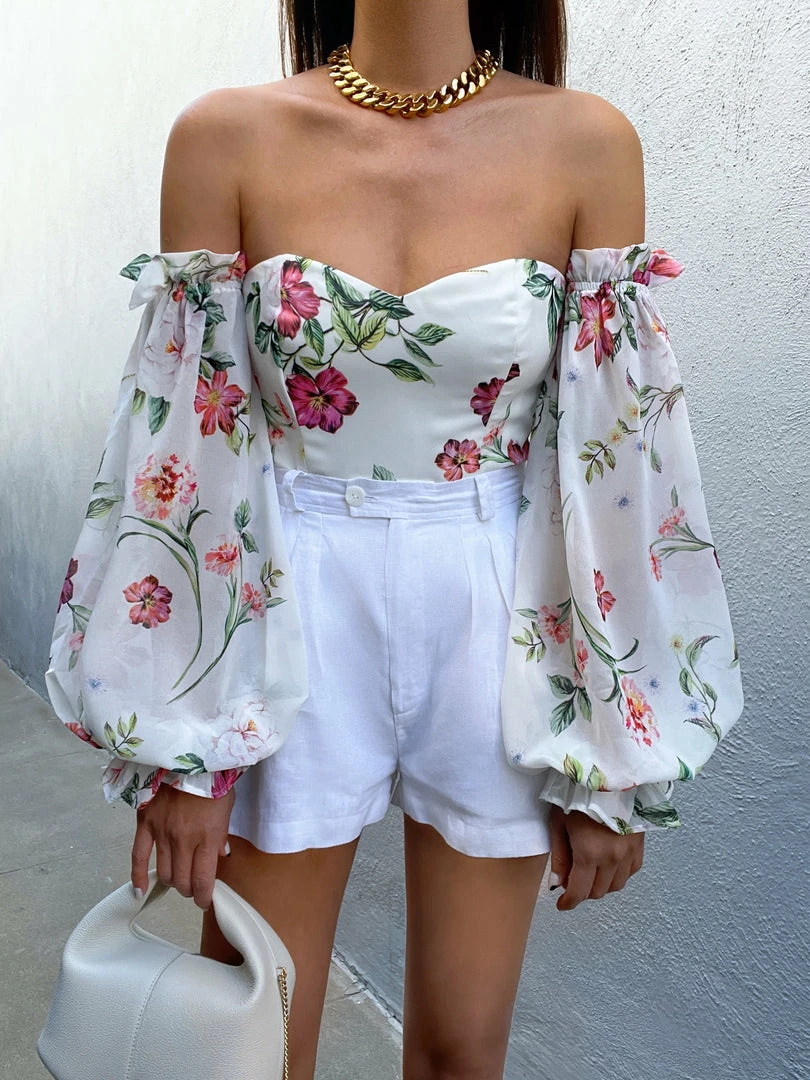 - Key Features: Off shoulder long sleeves. Elasticated cuffs. Sweetheart neckline. Lining. Shirring on the back.
