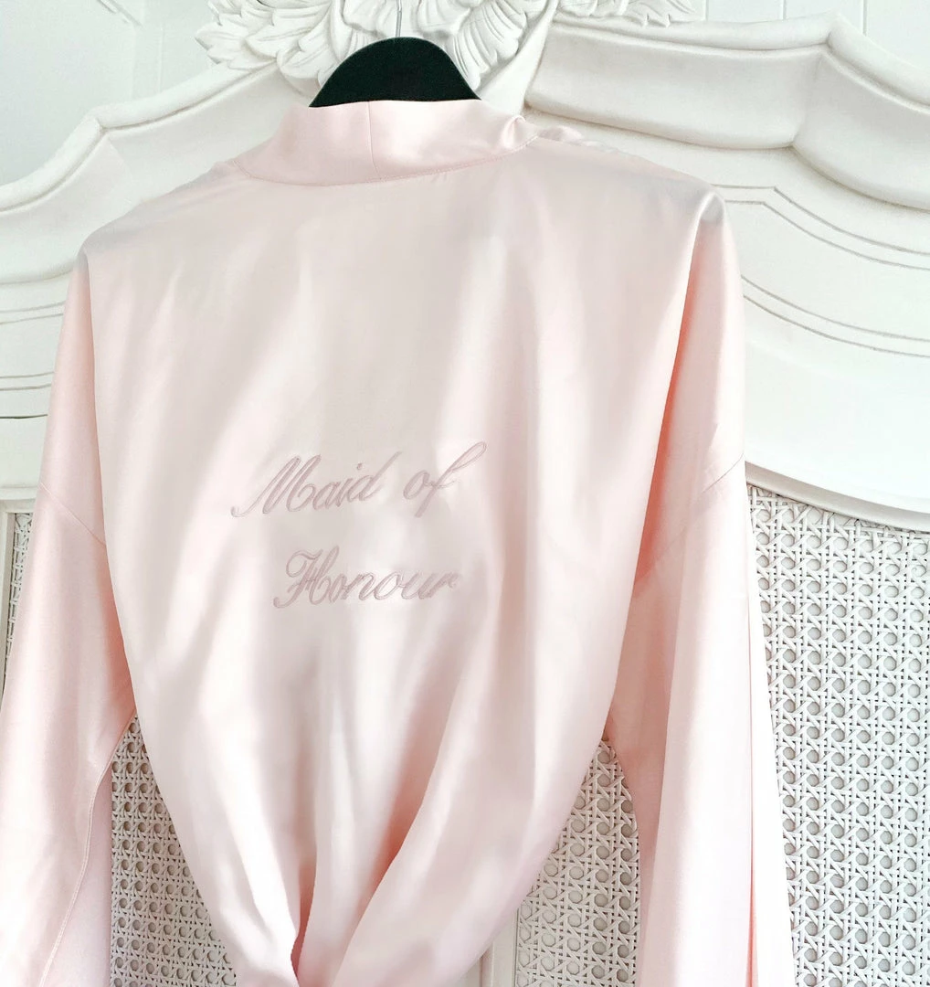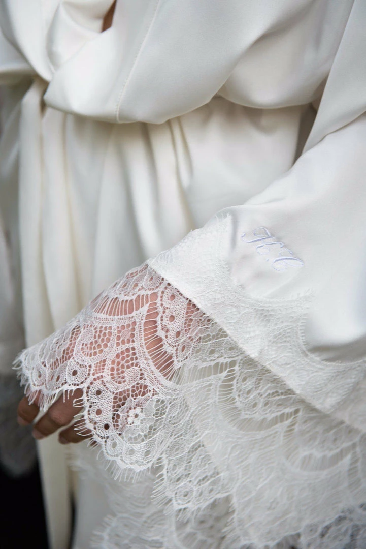 For ultra-luxe glam, our Ivory Kimono Short Robe in baby pink w. lace detailing.