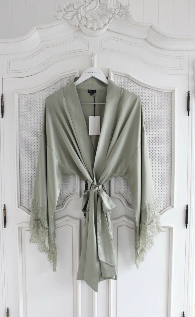 We’re green with envy over this dreamy new colour! For ultra-luxe glam, our Kimono Short Robe in new pistachio w. lace detailing.