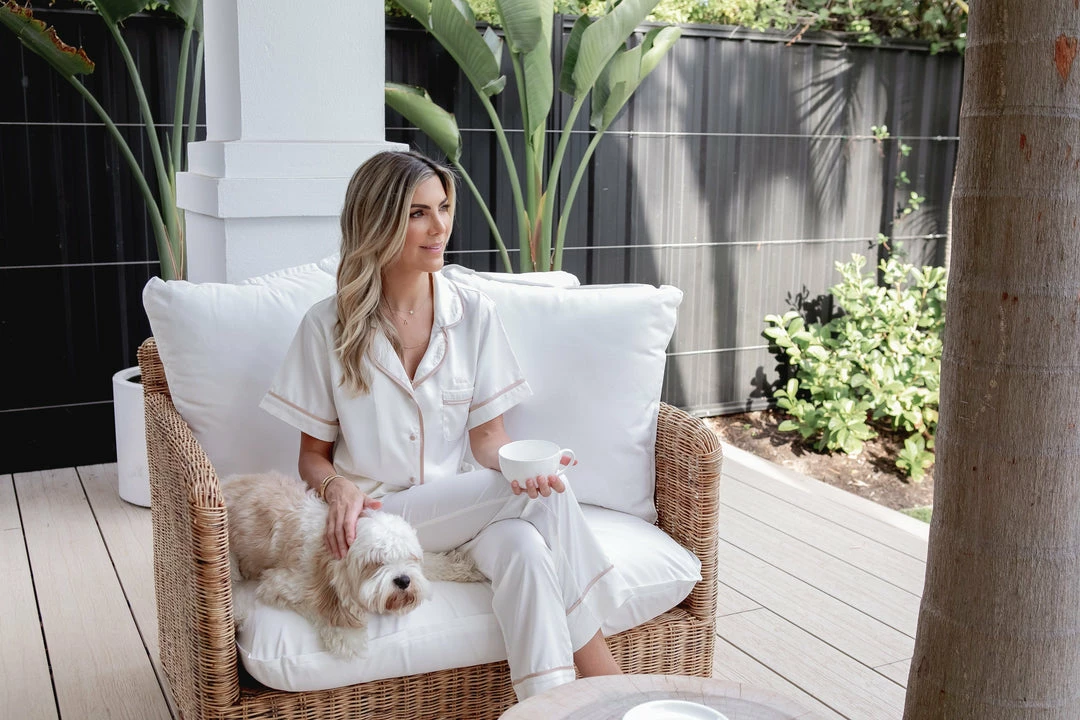 HELLO NEW! Perfect for the cooler months, our classic Autumn W. The Enemy short sleeve top w. drawstring pants in ivory and tan contrast piping.