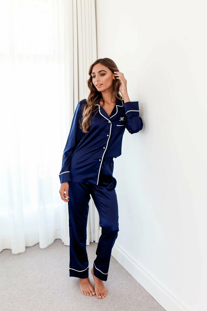 The OG of sleepwear! Our classic Winter W. The Enemy long sleeve top w. drawstring long pants in navy and white contrast piping.