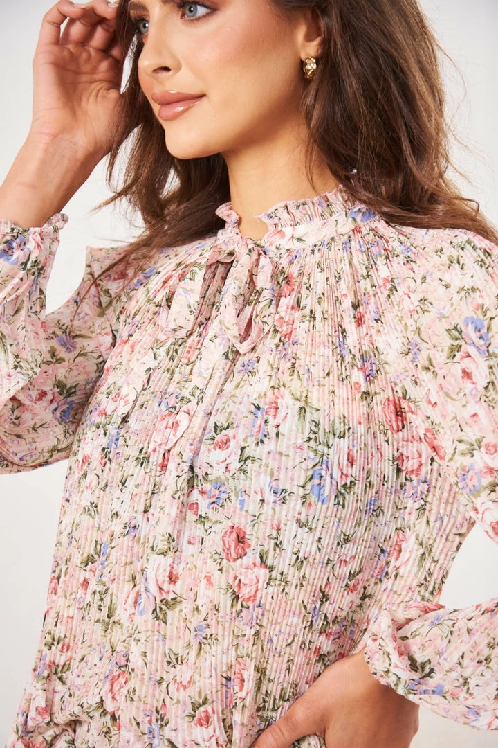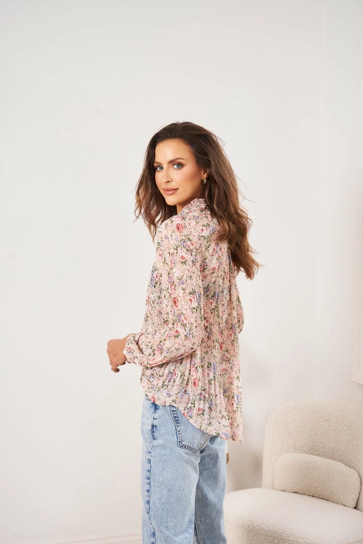 Our Viorica Top comes in a blush tone floral print, with lilac and green undertones. It features a v neckline, long sleeves & buttons on the front. This cute top pairs wondefully with basic pants for an effortless transseasonal look!