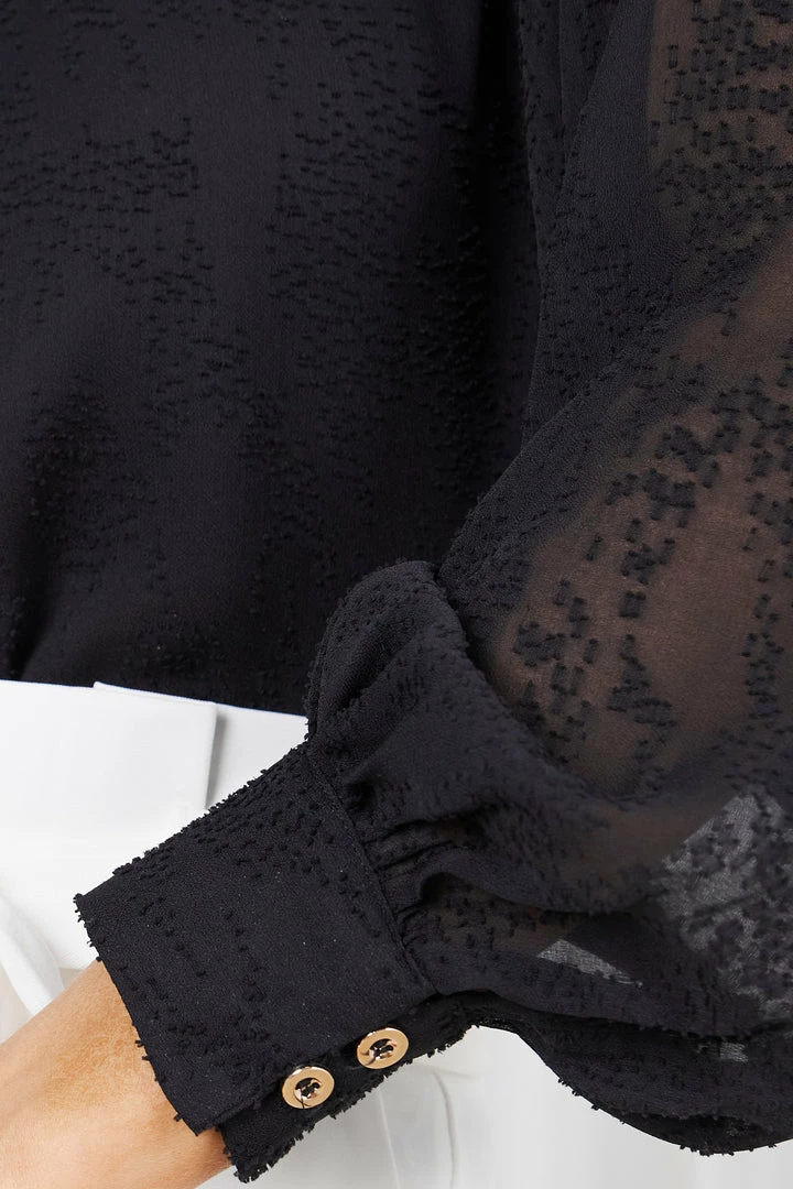 Our Adamia Blouse comes in a classy black colour. Bring out your dark and mysterious side in this sheer blouse that features a twisted knot collar, front keyhole, long sleeves and lace detailing all over. Wear your hair up and pair with a knee-length draped skirt for a sexy sophisticated look!