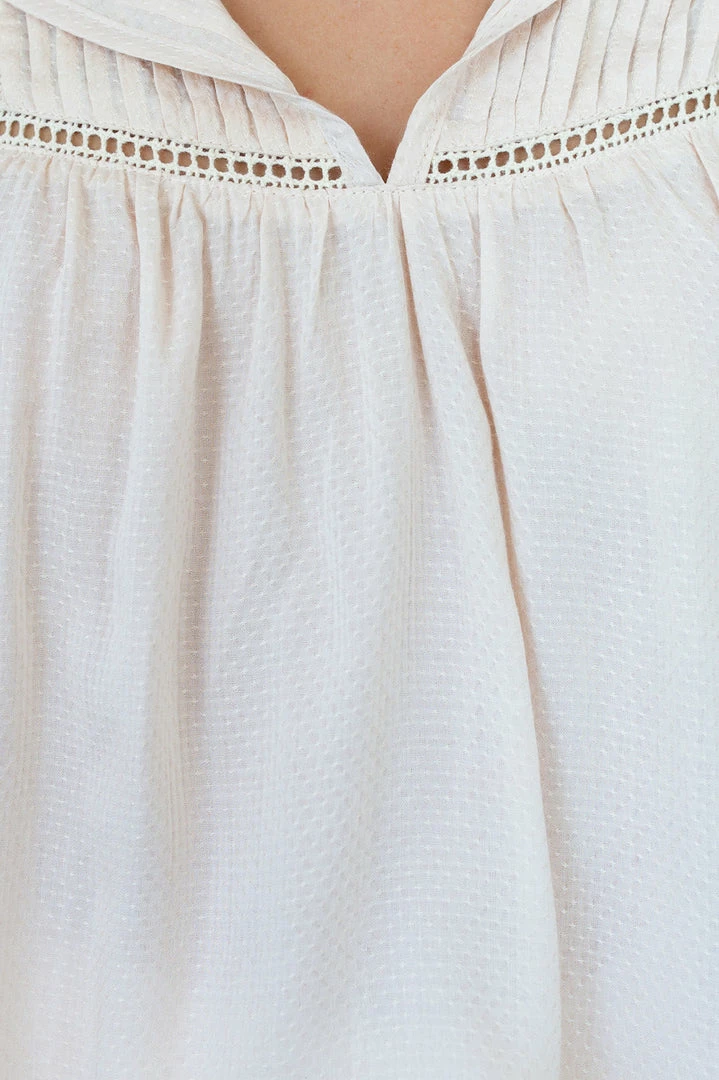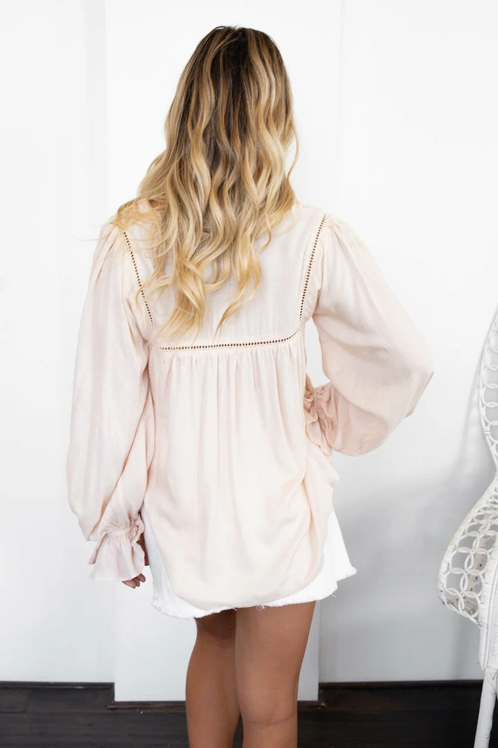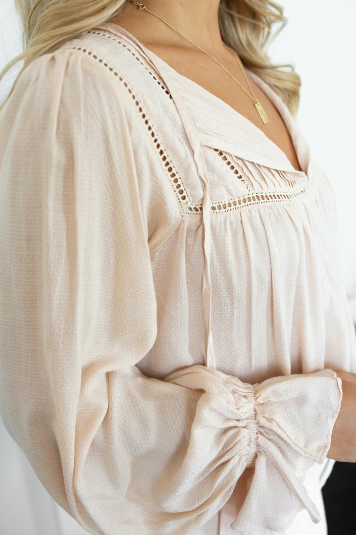 Our Emma Top comes in a lovely neutral light beige tone. The V neckline with tie detailing, ladder lace detailing across the chest, and cinched sleeves with frill detailing are stunning additions to this piece. This blouse can be easily dressed up for everyday wear or even for the office.