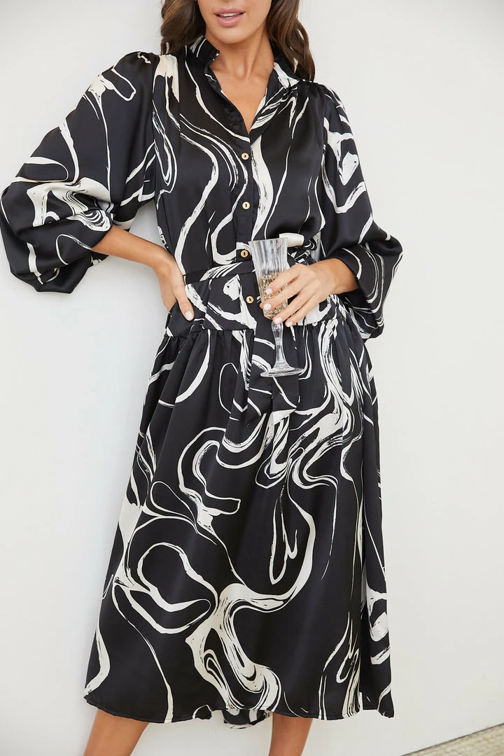 Our Frankelle Dress comes in a rich black base with cream prints. A modern approach to the swinging 50’s, this midi features a traditional collar, centre-front buttons, long bishop sleeves and fabric belt. Glam up with neutral shade stilettos and a vintage hairstyle!