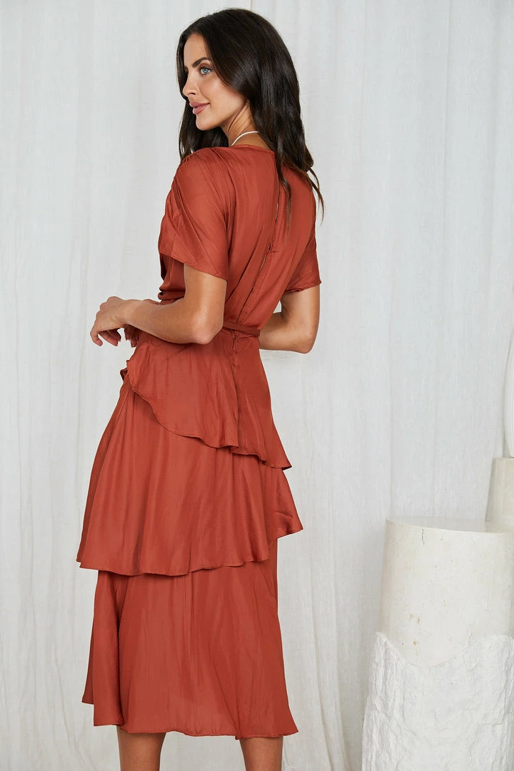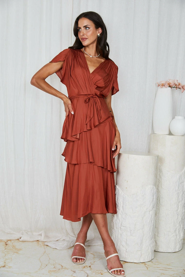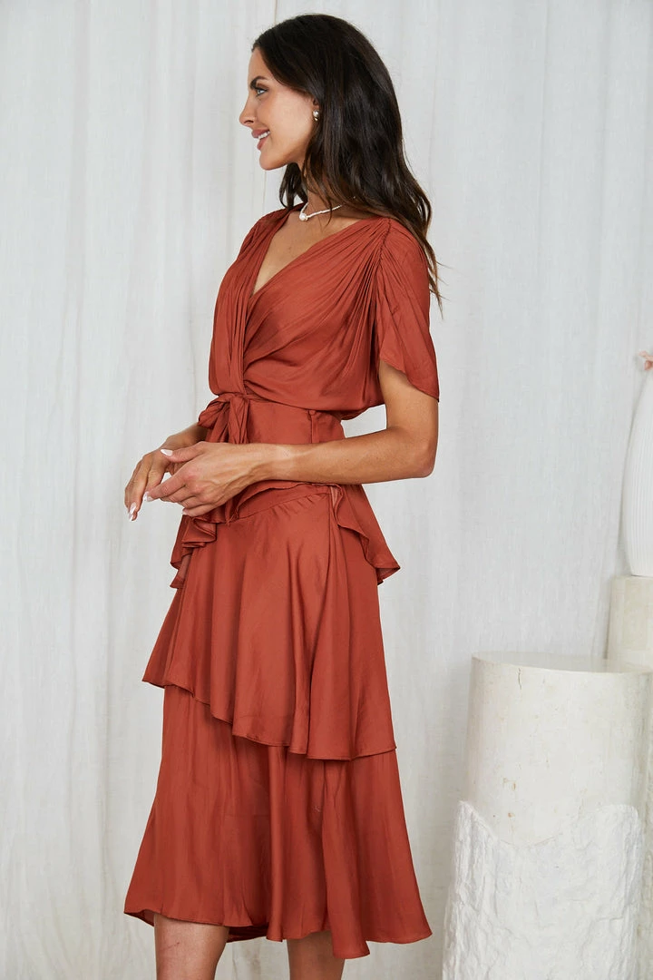 - Key Features: Midi length. Relaxed fit. Wrap-style bodice. V neckline. Petal sleeves. Fabric waist tie. Gathered tiered skirt. Satin finish material.
